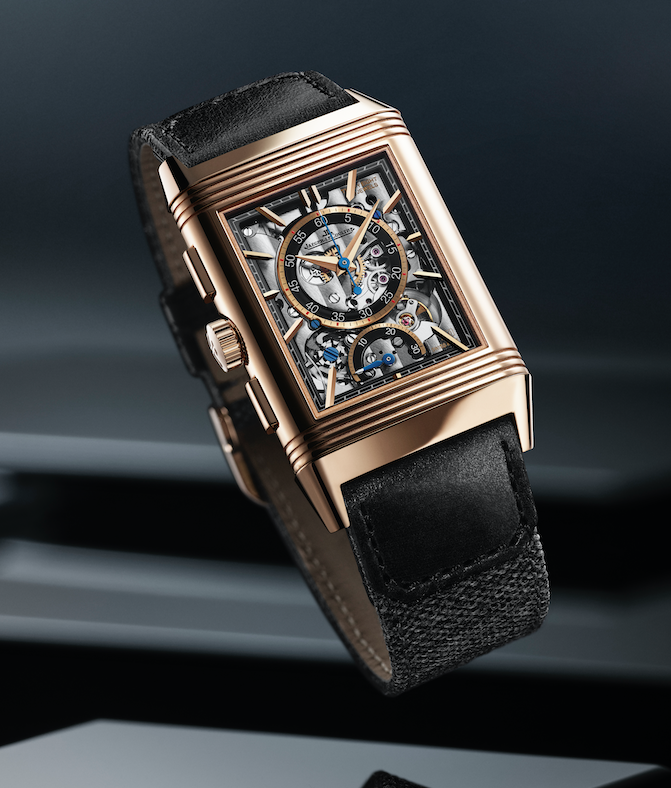 Bearing all of the hallmarks of the Reverso Tribute line, the front dial of the watch features the baton hour markers, Dauphine hands and peripheral chemin de fer minutes track. But when one flips over the watch case, it reveals the beautifully crafted chronograph mechanism on the reverse side. The dial is entirely skeletonised to showcase the fascinating animation of the chronograph and full complexity of the movement, while the bridges are decorated with Côtes de Genève to create visual unity. The chronograph seconds and minute tracks are highlighted in black to maximise legibility, with blue screws to match the blue of the chronograph hands.