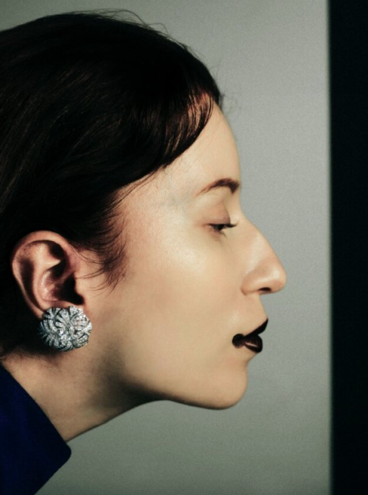 On Claudia: La Rose Dior ear cuff, black jacket and white blouse _ Dior