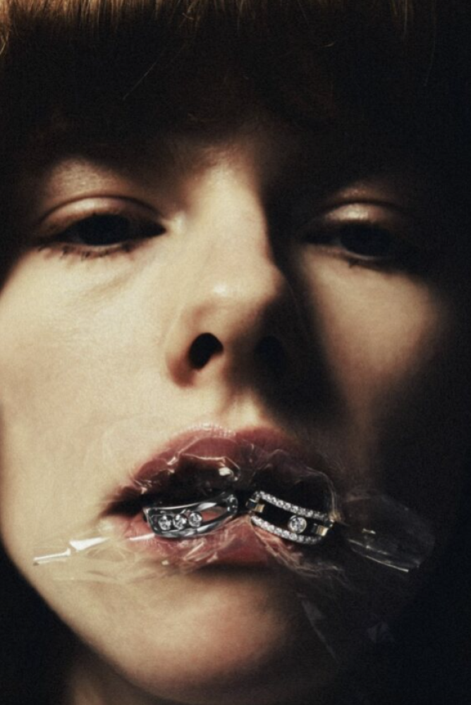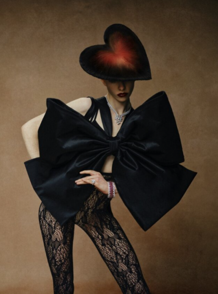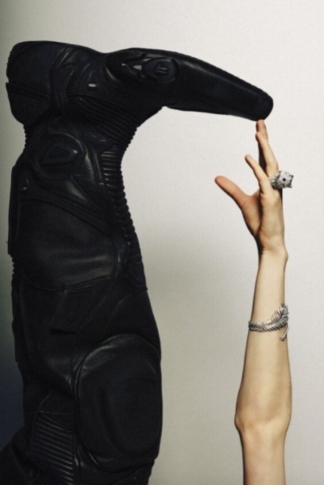 On Claudia: Bracelet in 18k white gold with sapphires and L’Heure du Diamant collection rng in 18k white gold with diamonds _ Chopard; Black faux fur coat _ Celine; Black ruffle hat with scarf _ Louis Shengtao Chen; Blue stretch jacquard knit leggings _ Wolford