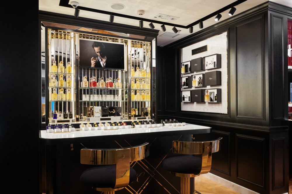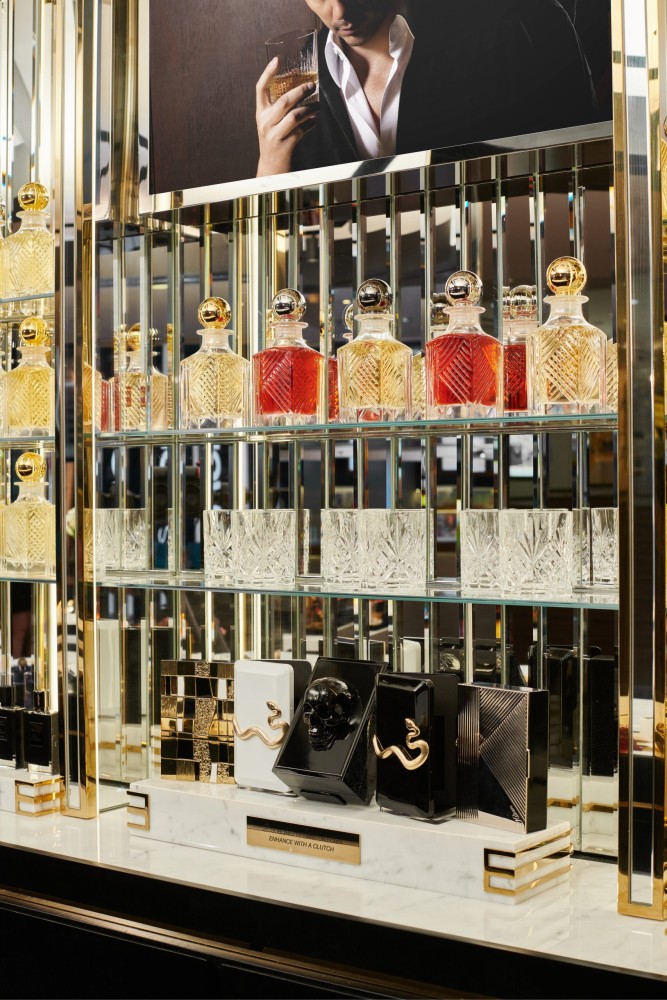 The flagship store’s design also takes on a very personal approach, inspired by Kilian’s nights out around the world. It’s designed like a fragrance bar, which is reminiscent of a chic bar in Europe. A perfume display fills the wall, where it showcases lacquered clutches and signature carafes, much like those used for cognac.