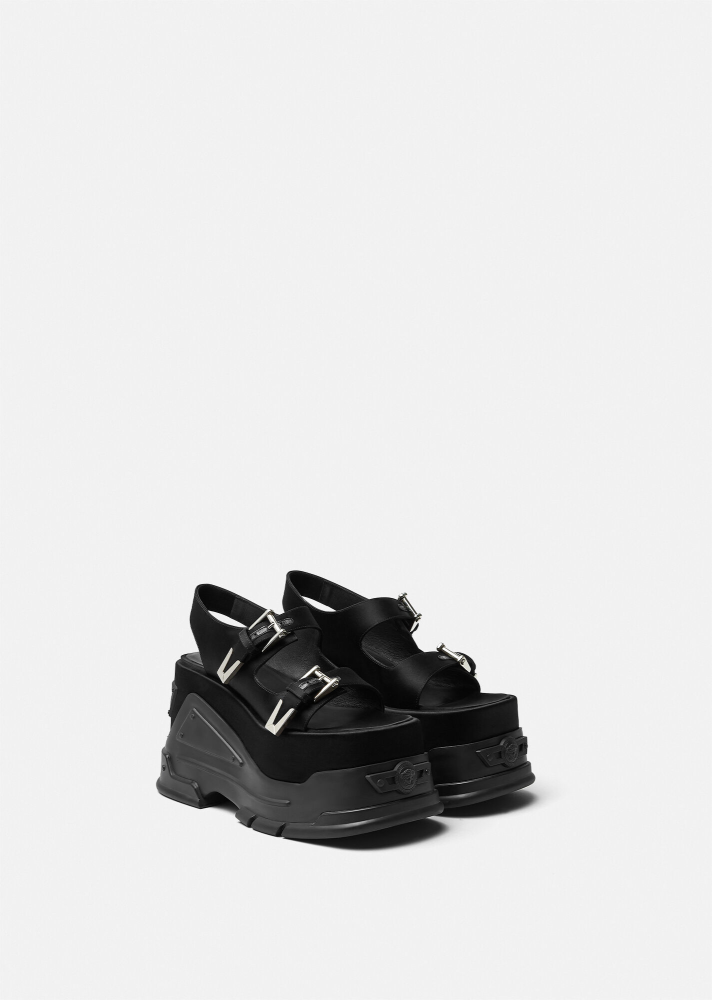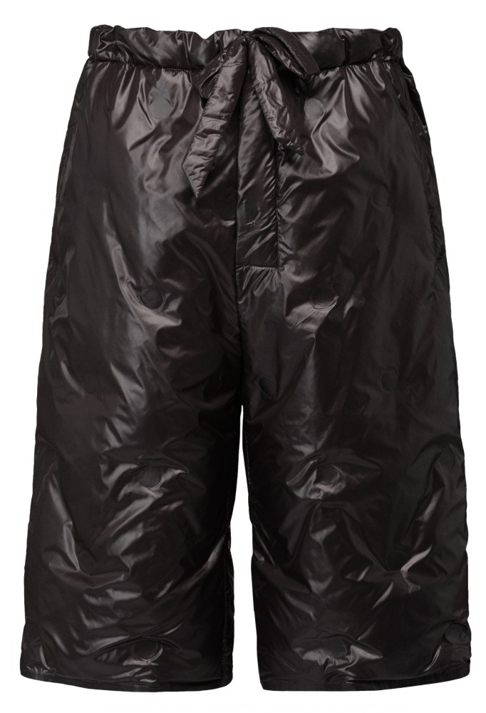 Bottom: Black nylon shorts _ Maison Margiela; Black platform sandals _ Versace.