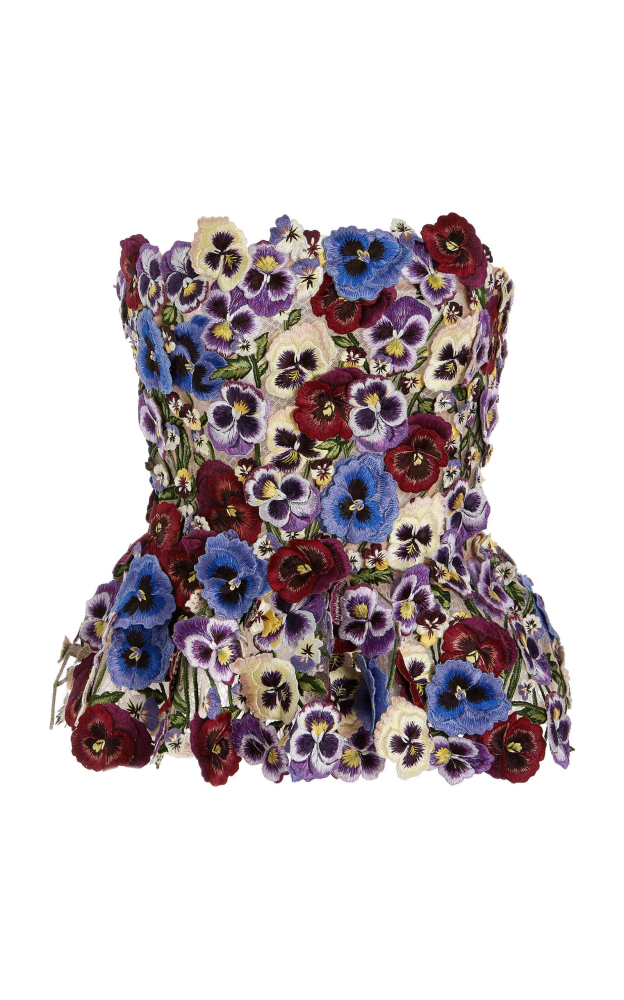 Peplums were all the rage circa the early 2010s, and now they’re coming back in full force – just look to the runways for proof. Givenchy’s spring 2022 collection featured peplum jackets with heavy zippers as its centrepiece, while Christian Siriano channelled a more polished iteration through sleek tailoring and asymmetrical elements. If you’re looking to ease into the trend, consider going neutral like model Emma Cheng. Or, get a little more daring with a statement style like this embroidered pansy-appliquéd tulle piece from Oscar de la Renta. Pair with cream separates and a matching blue heel to finish.