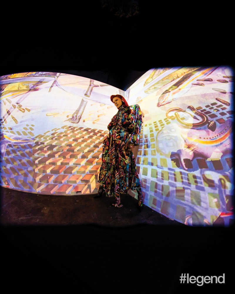Model in Balenciaga printed multicoloured top with matching skirt and leggings, and black leather pumps Salvador Dali, The Disintegration of the Persistence of Memory, 1952–1954 -