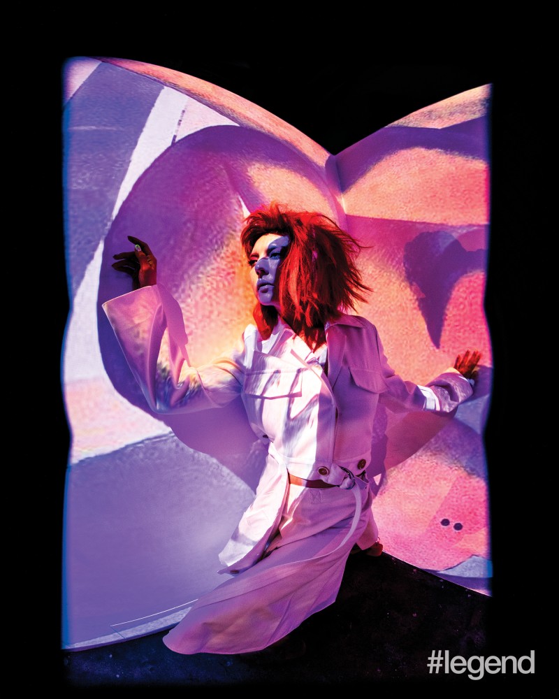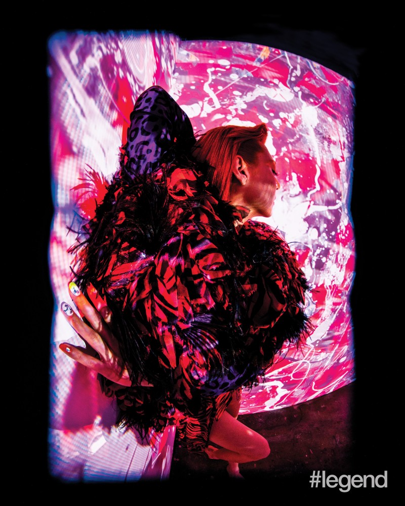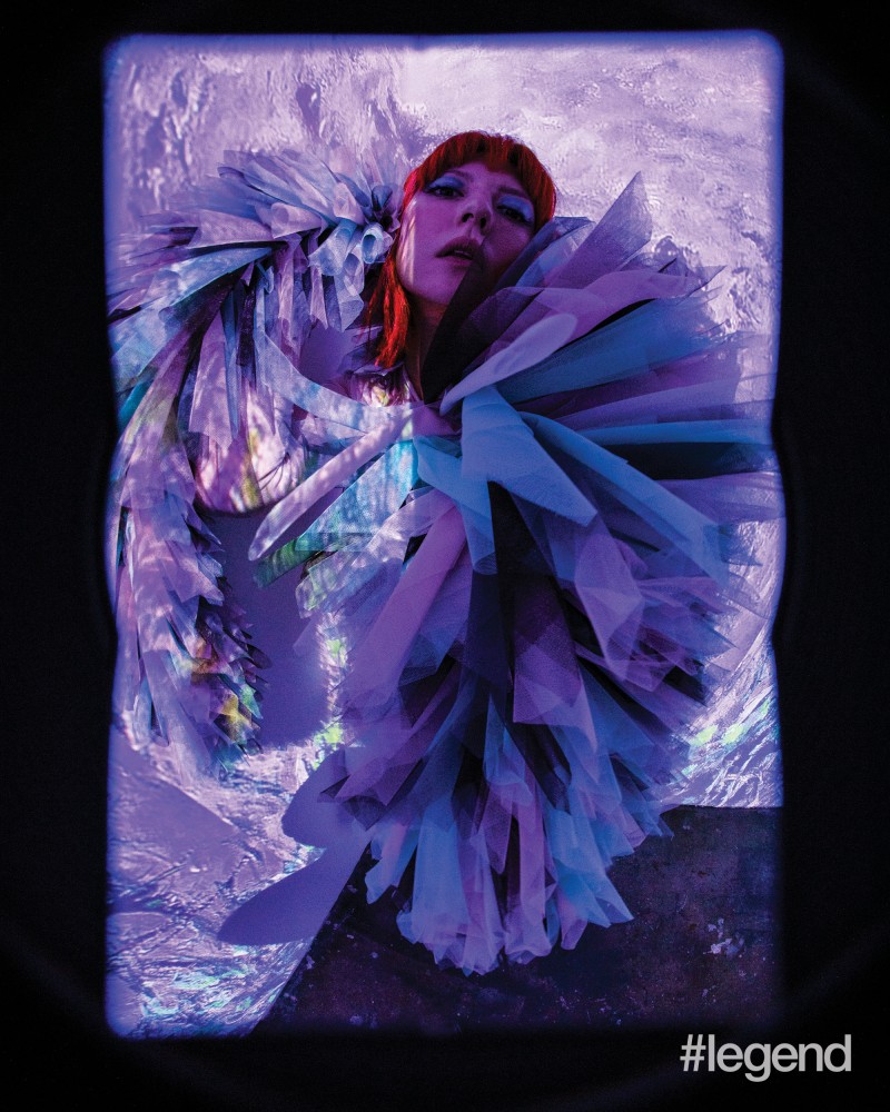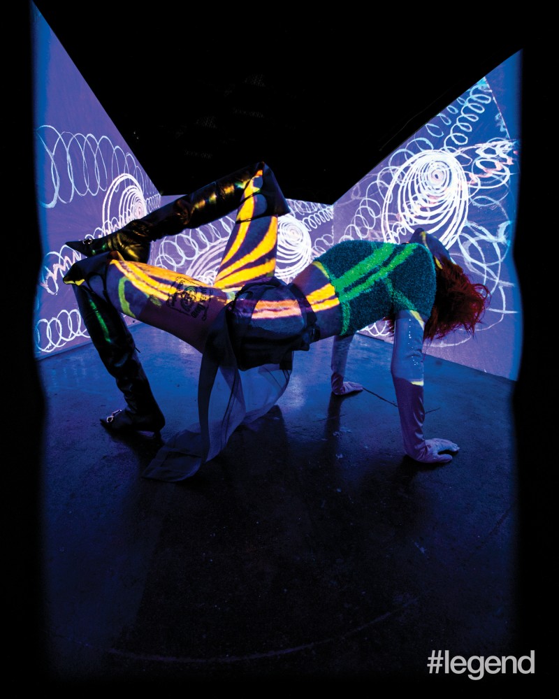 Model in Gucci green knitted top, purple chiffon dress, black thigh-high boots and cream patent gloves Hilma af Klint, Primordial Chaos No. 16, 1906–1907 -