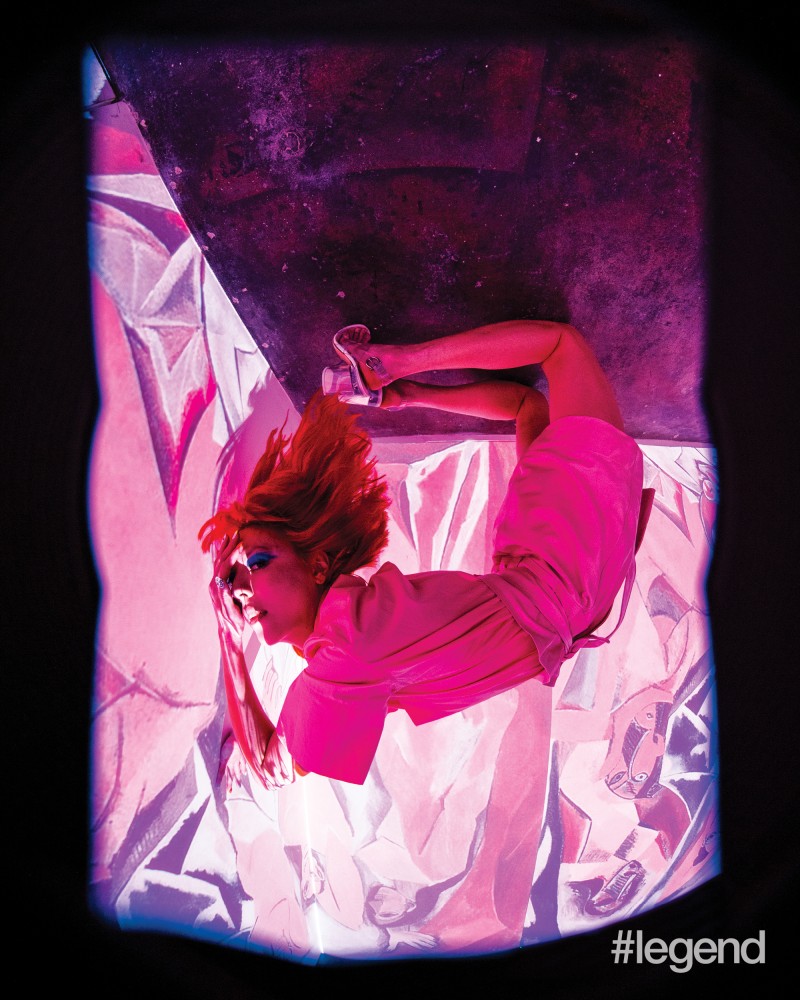 Model in Salvatore Ferragamo pink shirt, matching leather skirt with belt and transparent sandals Pablo Picasso, Les Demoiselles d’Avignon, 1907