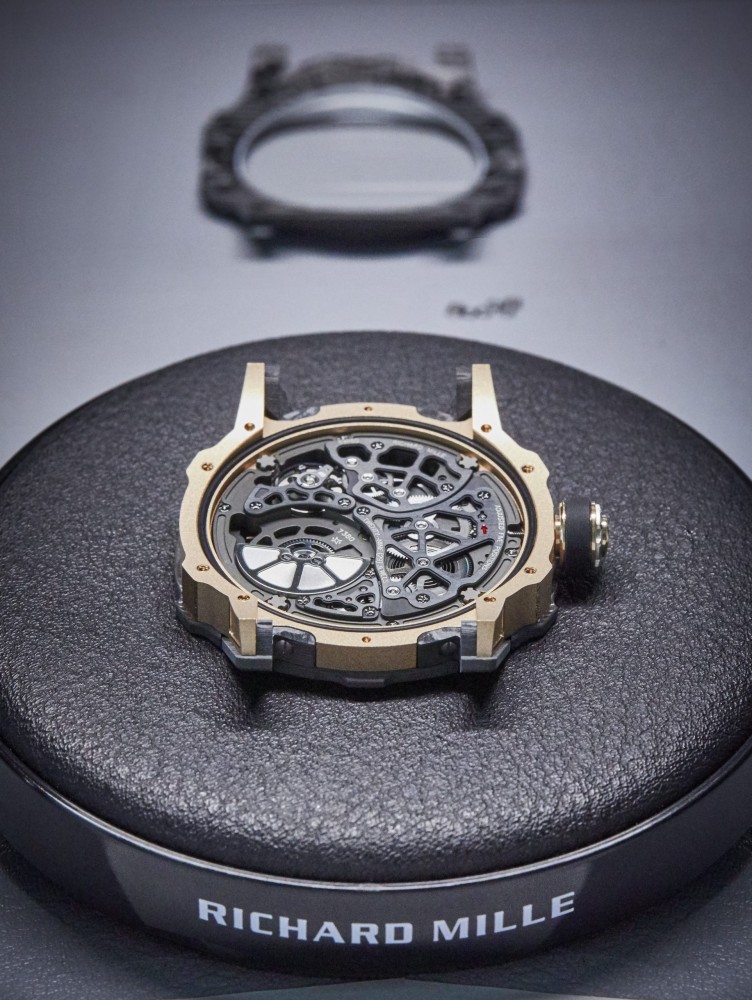 The 41.7mm case of the RM 33-02 is 4mm smaller than the RM 033, and is presented in a mix of red gold and carbon TPT, the latter making its debut in an automatic round watch. All this makes for a sporty-luxe version that’s more contemporary in dimension and suitable for everyday wear. “We have reinterpreted its aesthetics without doing a disservice to the original version by accentuating its lines,” notes Julien Boillat, the brand’s technical director, who also oversaw the RM 033’s creation. “Meanwhile, the exterior decoration, case and dial have been reworked to project a sportier vibe. The RM 33-02 thus achieves a delicate synthesis of the so-called ‘lifestyle’ style and sporty style.”