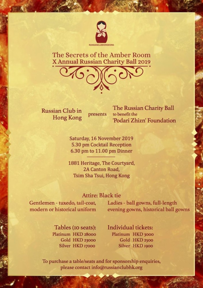 The sizzling weather has just gone – and that means it’s ball season in Hong Kong. Meaningful, romantic and lively, the “Secrets of the Amber Room” annual Russian Charity Ball returns to Hong Kong on Saturday to kick things off. Held on November 16 from 5.30pm to 11pm at the courtyard of 1881 Heritage in Tsim Sha Tsui, the dress code is strictly black-tie.