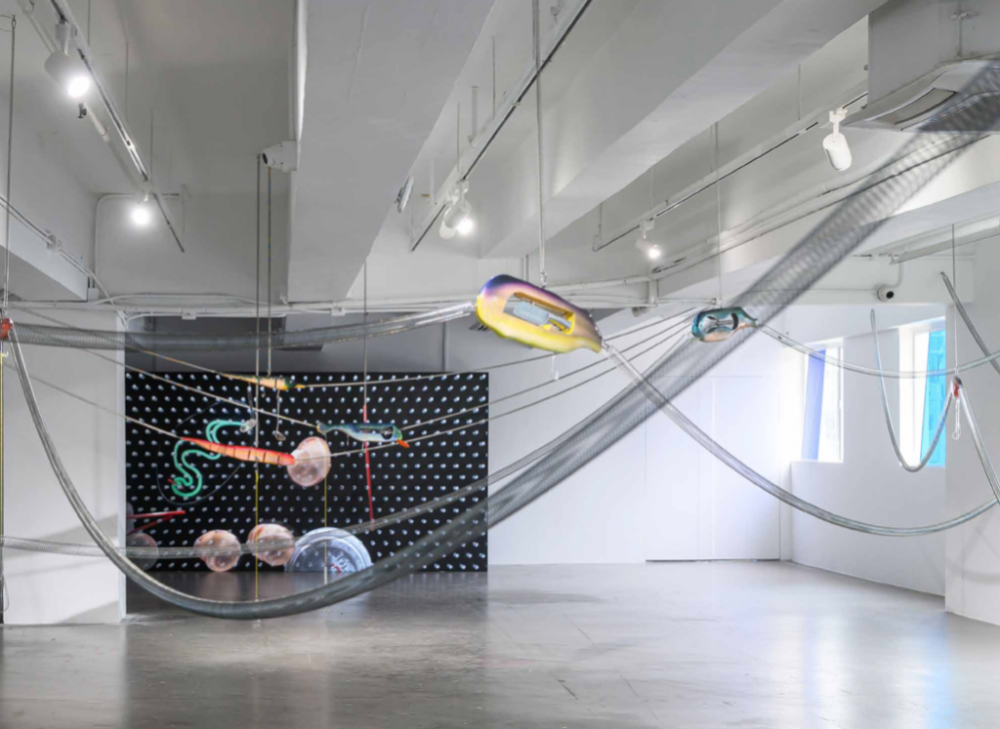 One could comment that Yeung’s work shares a similar theme with New York-based artist Aki Sasamoto’s Sounding Lines now showing on the top floor of Para Site’s industrial building in Quarry Bay. The newly commissioned installation is situated between sculpture and performance, and is in conversation with a recent moving-image piece, Point Reflection. “Yeung’s work is a poetry of that experience when it connects to Sasamoto’s piece upstairs, which is also in a way an invention of a new object. It’s a performance where the objects instead of humans propel the performance, and with this, the objects become animated and active.