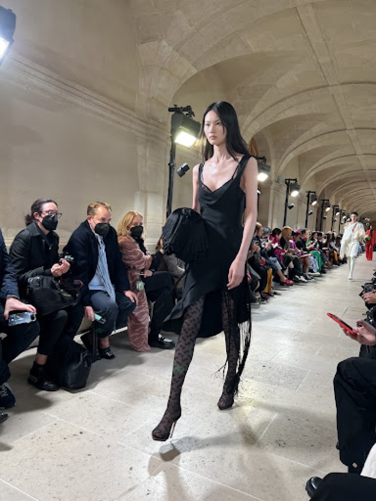 Day four of my Paris fashion week started with a trip to Loewe. This season the historic house presented a whimsical collection that aimed to reduce, tighten, and redesign the feminine silhouette. Soothing notes from violins set a light-hearted mood as the opening look worn by Taylor Russell commenced the show. The star who acts alongside Timothée Chalamet in the soon-to-be-released film Bones and All wore a deep black velvet dress that protruded at the waist – creating a structured hourglass silhouette. The dress made three equally dramatic appearances on the catwalk.