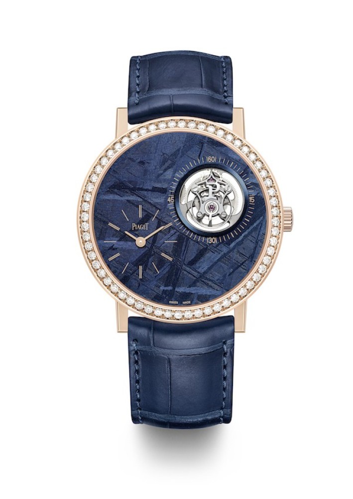 The Altiplano 40mm bazel is set with 72 diamonds (approx. 1 carat) with blue meteorite and pink gold finish and comes with a blue alligator strap and is limited to 300-pieces. Whereas the Altiplano Toubillon in 41mm (which is my favourite from this collection) comes with blue meteorite dial with its off-centered hour and minutes at 8 o’clock and flying tourbillon at 2 o’clock. This is also accompanied with a blue alligator strap and numbered limited to 28-pieces.