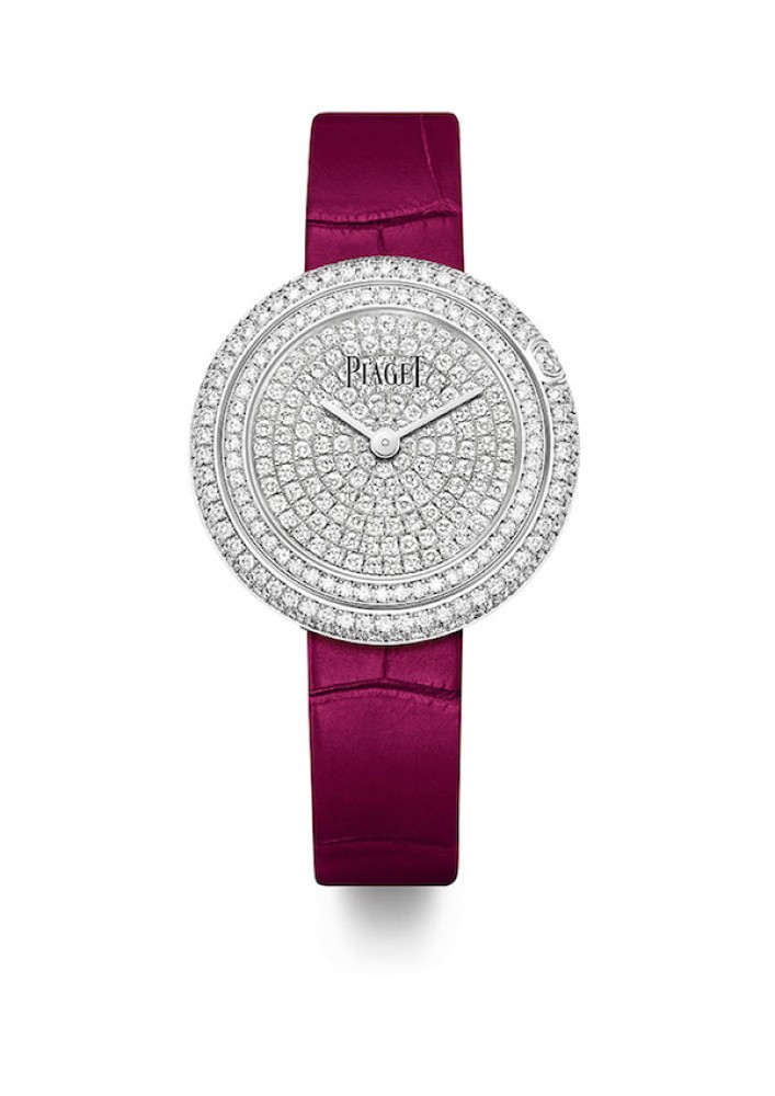The other two Piaget Possession watches are in 18K white gold set with diamonds on both dials. Both models had deep cherry-pink interchangeable straps in 29mm and 34mm.