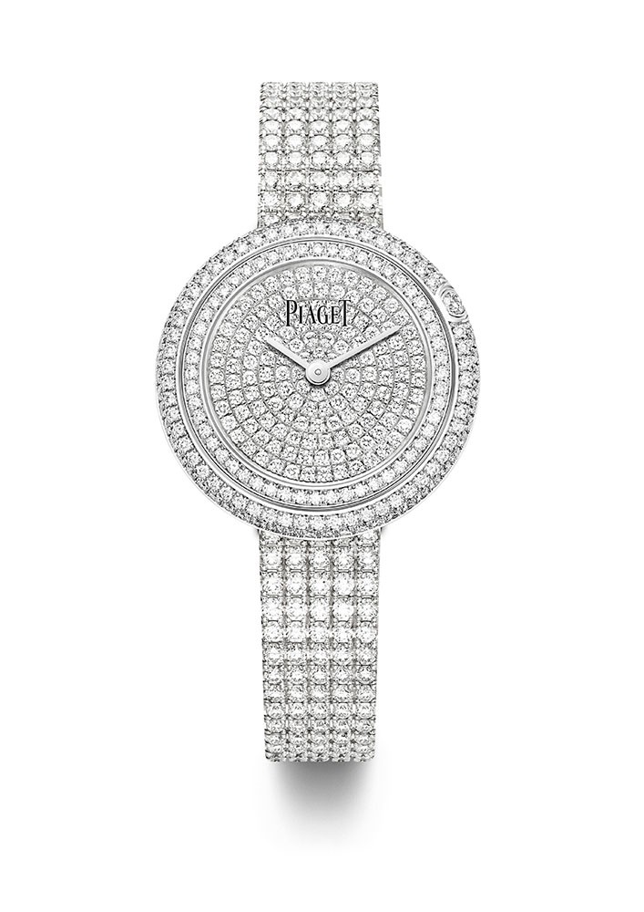 A high-jewellery model in white gold further showcases the rarefied extremes of this in-house savoir-faire, featuring a fully paved dial and case as well as a diamond-paved bracelet. The diamond river bracelet — so called because of the glittering fluidity of the individually hand-set stones — is a particular speciality of Piaget. Despite the number of diamonds and intricacy of the underlying white-gold structure, the bracelet remains astonishingly supple, clinging to the wrist like a second skin. The 29mm case in 18K white gold is set with 162 brilliant-cut diamonds, approx. 1.55 carats.