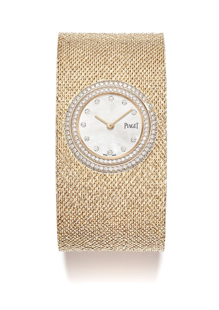 The final model is comparatively restrained in its use of diamonds but exerts maximum impact with its expert application of gold-working, a skill for which Piaget is historically famed. A full cuff of hand-worked textured Milanese mesh is paired with an iridescent mother-of-pearl dial that complements the effervescent shimmer of the textured mesh. Both the case and the iconic rotating bezel are fully set with diamonds, forming the perfect accompaniment to the exquisite gold-worked cuff. The Possession Cuff watch came in 29mm cased in 18K pink gold set with 162 brilliant-cut diamonds, approx. 1.55 carats, and the mother-of-pearl dial is set with 11 diamond dots indexes (approx. 0.07 carat) cuffed in 18K gold Milanese mesh.