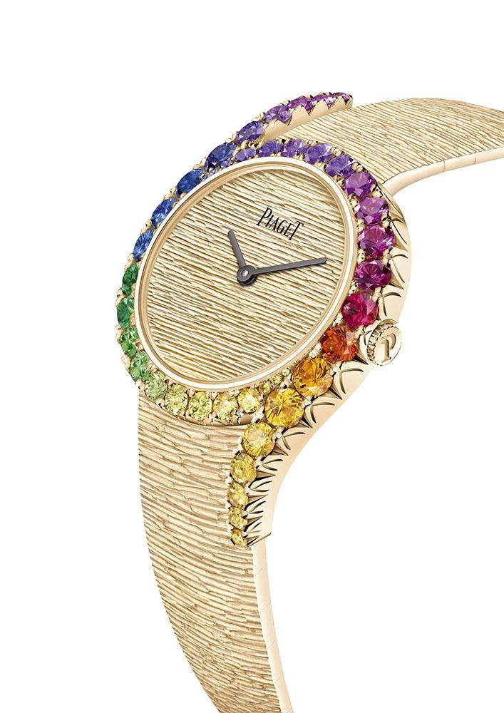This year, Piaget took the theme of charting the sun’s movement through the day to create the Limelight Gala Precious Limited Edition, which features gemstones in blue (for the morning sky), yellow (for the sun at its zenith) and pink (for the glow of the setting sun).