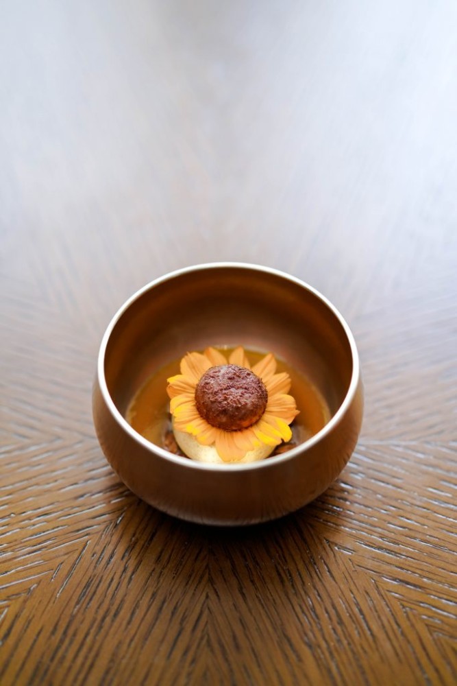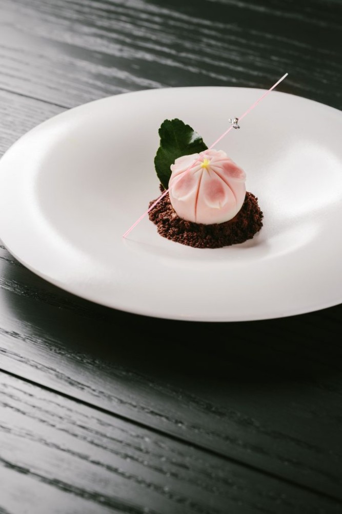 With simplistic presentation and a talent for harmoniously fusing Japanese elements, Yuen approaches her desserts with a set of ground rules: a maximum of four ingredients in a pre-dessert, which also cleanses the palate to prepare guests for the proper dessert course that follows, and not more than three distinct flavours and textures in the main dessert. Her pre-dessert changes seasonally, from a tofu panna cotta with Spanish nectarine, accented with whisky granita and a tangy foam made with dark sugar-marinated purple ume plums, to a playful take on apples marinated with Sherry vinegar and in sorbet form, with candied walnuts and lemon balm for a herbaceous touch.
