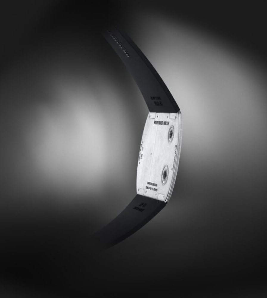 The RM UP-01 manual-winding movement with hours, minutes and function selector measures a thickness of 1.18mm, a weight of 2.82g and a power reserve of 45 hours. It’s also capable of withstanding accelerations of more than 5,000 g’s, compared to the highest horizontal g-force ever survived by a human being of 214 g’s and a Sprint missile’s acceleration of about 100 g’s.