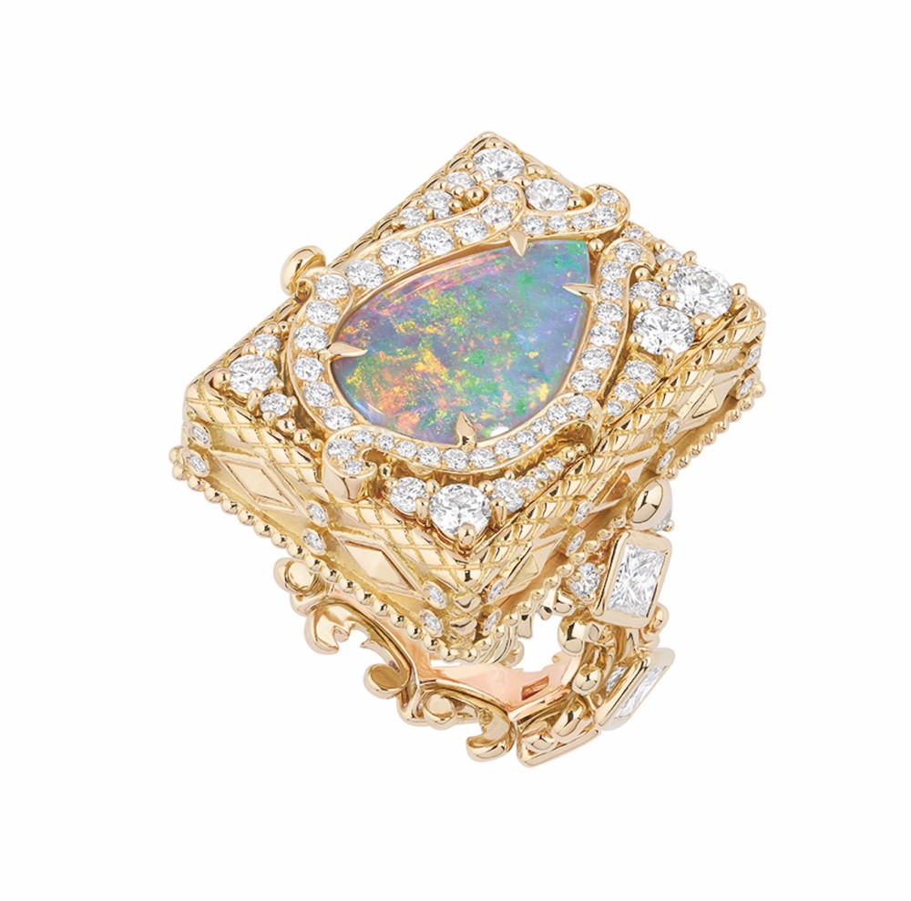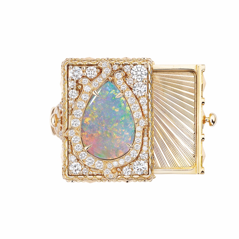 The Dior à Versailles Pièces Secrètes Cachette Tiroir Opale Claire ring is a playful yet magnificent design with its secret compartment hidden behind inside a rectangular case of yellow and white gold with diamonds, with a large light opal as the central stone.