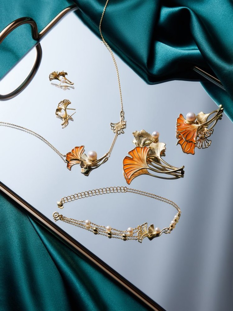The collection’s demure Ginkgo jewellery collection is vibrant and delicate. The Ginkgo symbolises health and longevity. Here enamel and fine natural pearls are used to create this exquisite series.