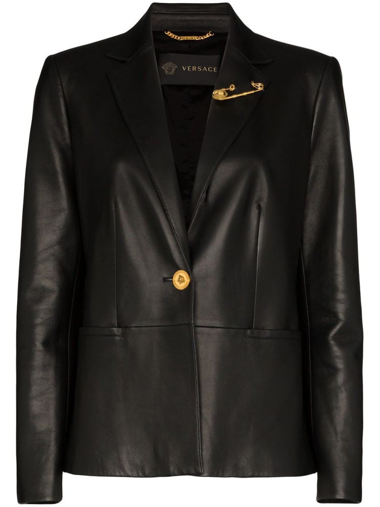 Versace safety pin-embellished leather blazer, available on Farfetch -