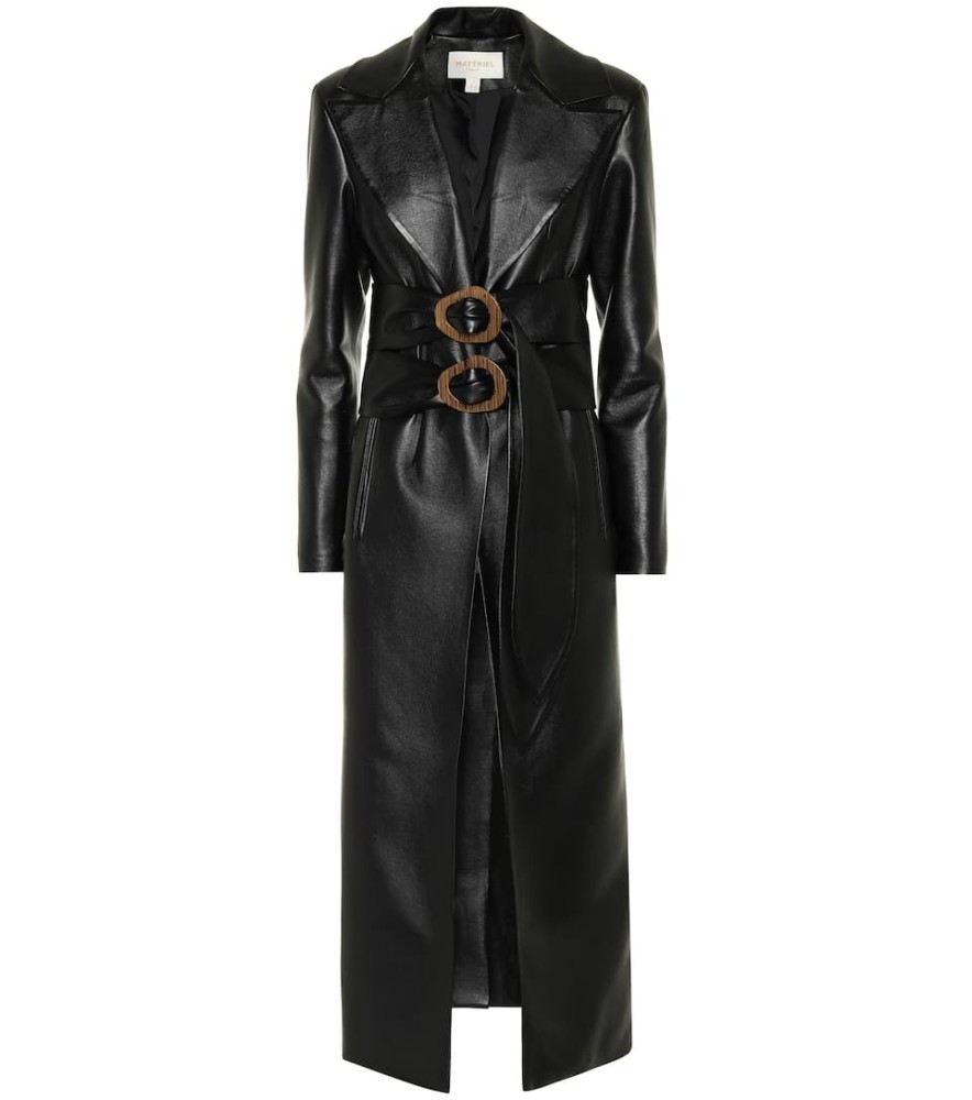 Double-belted faux-leather coat, available on Mytheresa