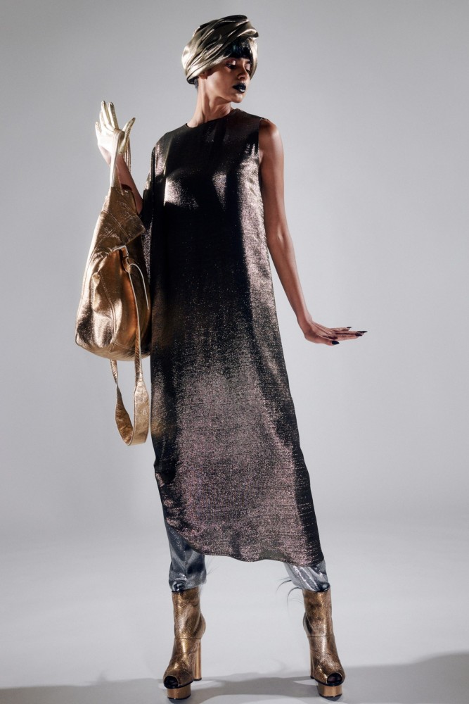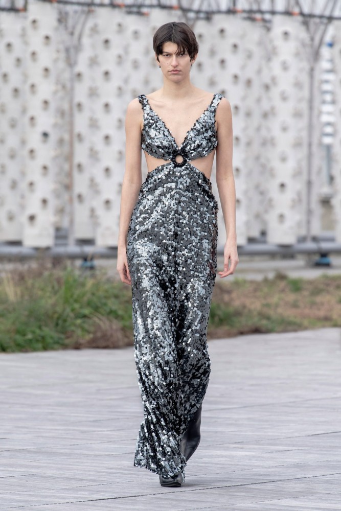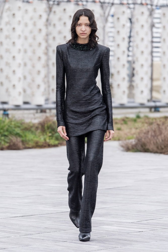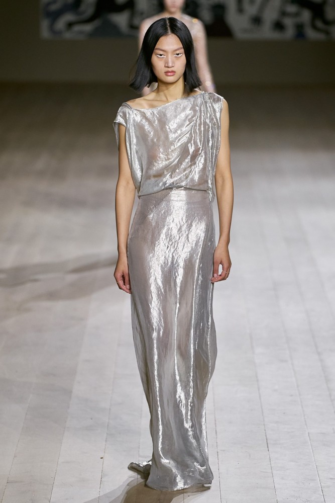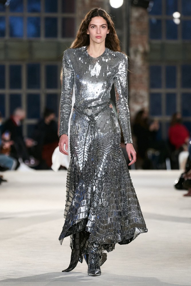 It is no surprise that Olivier Theyskens – whose impressive career has been built upon his reputation for designing wearable, flattering clothes – opted for a sleek, unisex collection that focused on suiting in space-age metallic fabrics designed to catch the eye. Not that there weren’t a few standout gowns made in sequins with the sort of sleek silhouettes that recalled the shapes of Y2K.