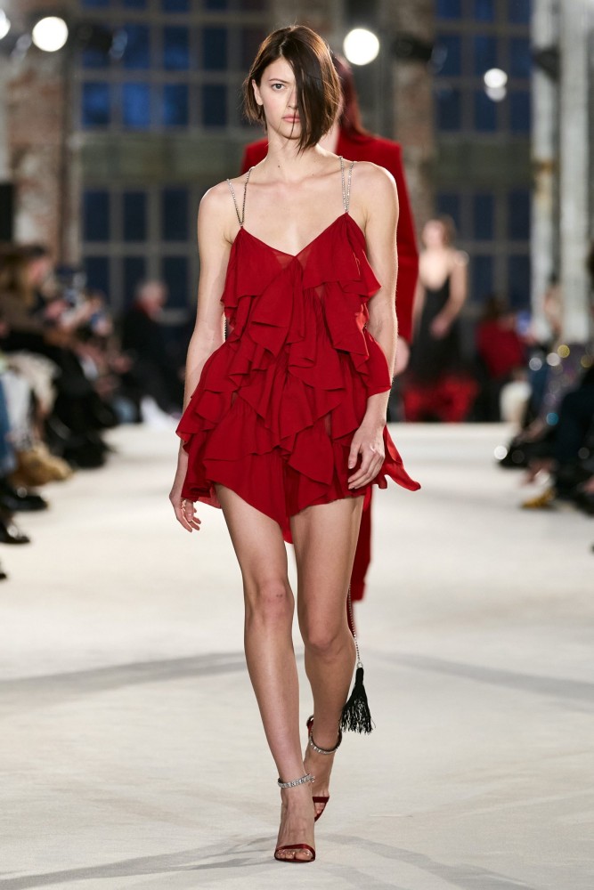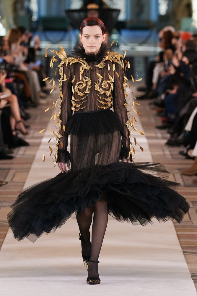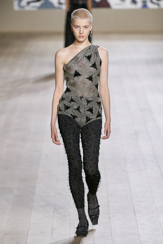 Alexandre Vauthier wanted to design the kind of collection clients could go dancing in, so naturally, he was inspired by the 1980s. Think shimmering sequins, floaty feather trims and beaded embellishments that make you dream of the Christmas party season. Standout looks included a black beaded dress that looked as though it had been dipped in crimson, mini dresses with embellished scorpions and luxe grey velvet dinner jackets. Turn the music up!