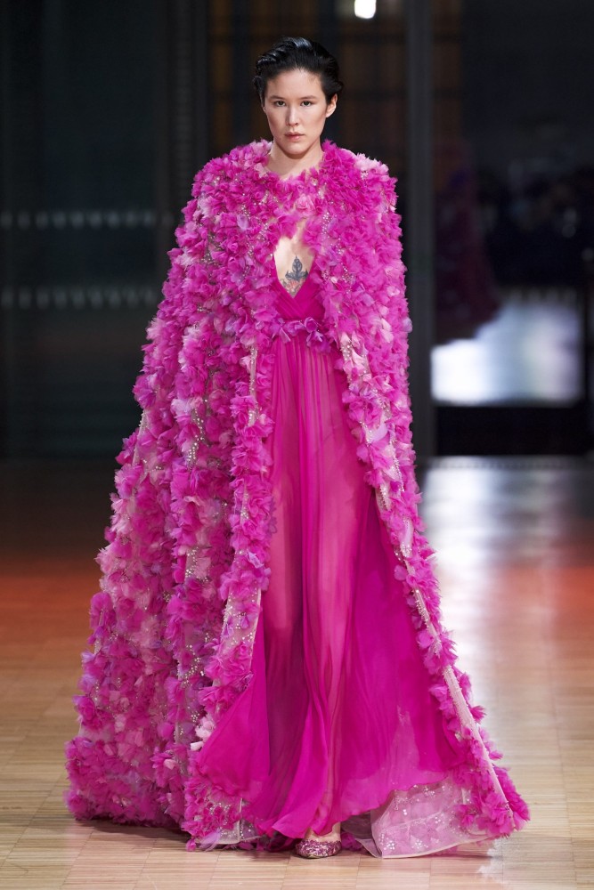 From the cold streets of midwinter Paris, editors and buyers were transported into a Mediterranean summer – or more specifically, a Lebanese one – when Elie Saab used hot pinks and deep purples to convey the beauty of organza bougainvillaea, the ultimate signifier of summer sunshine and a flower that blooms in his hometown of Beirut each June. A deep pink dress covered in tulle petals fluttering off the model’s shoulders was a standout look