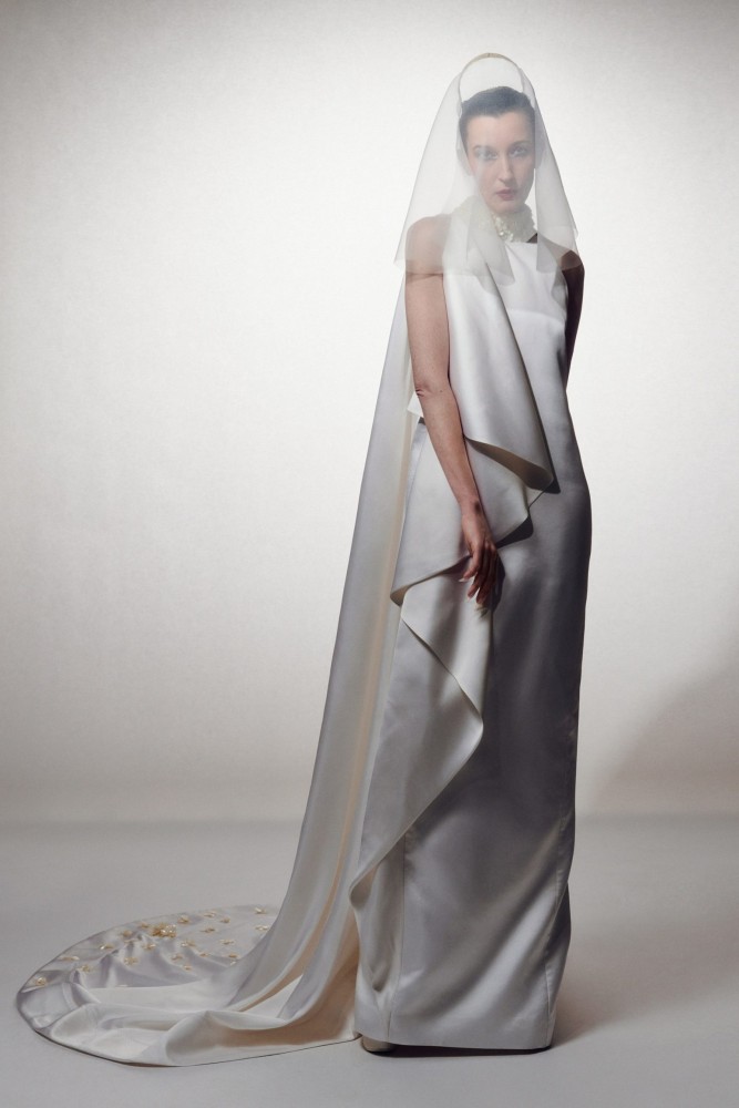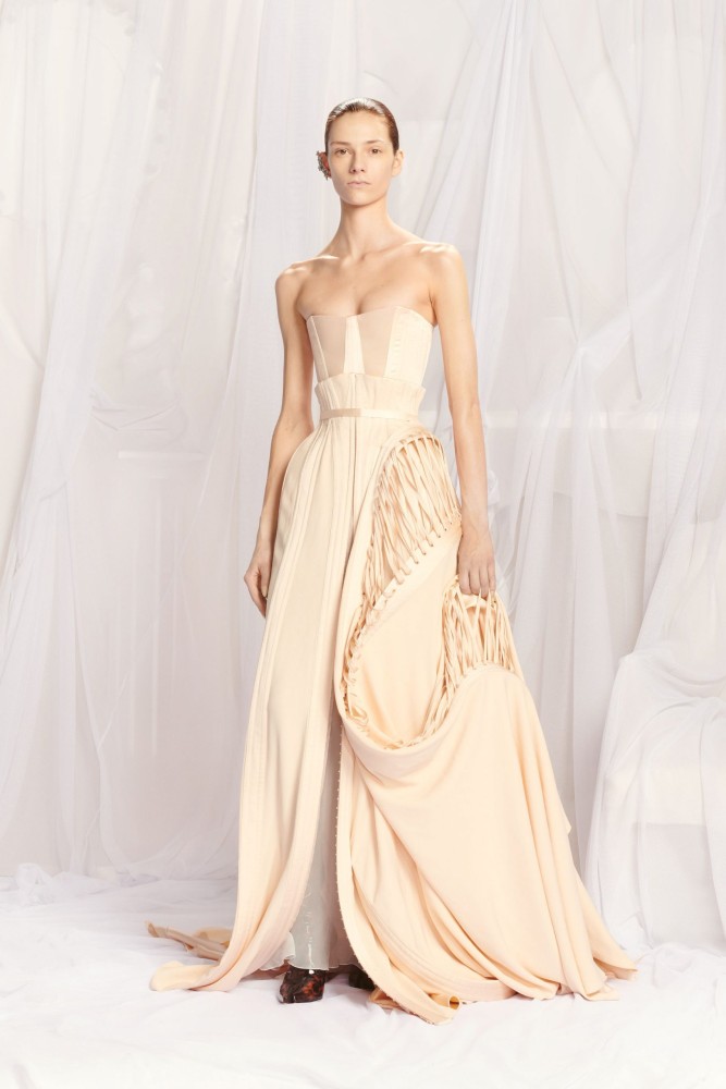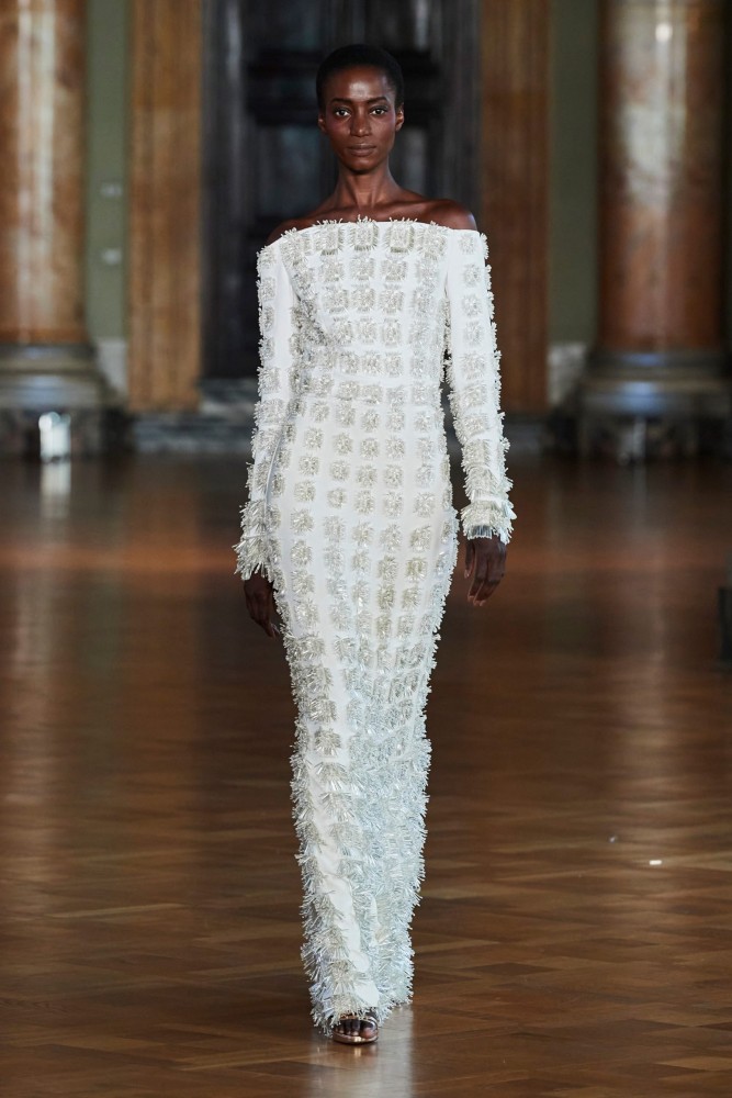 This was a collection that will inspire clients to book the next flight to New York. Why? Because there was something inherently Manhattan about the designs, from monochrome dresses to sleek column gowns in hot pink and an array of buttery coloured slips and off-the-shoulder tops. The most memorable piece – a pale beige embellished mini dress with a sweeping train – looked designed to be worn at a party by Carrie Bradshaw herself.