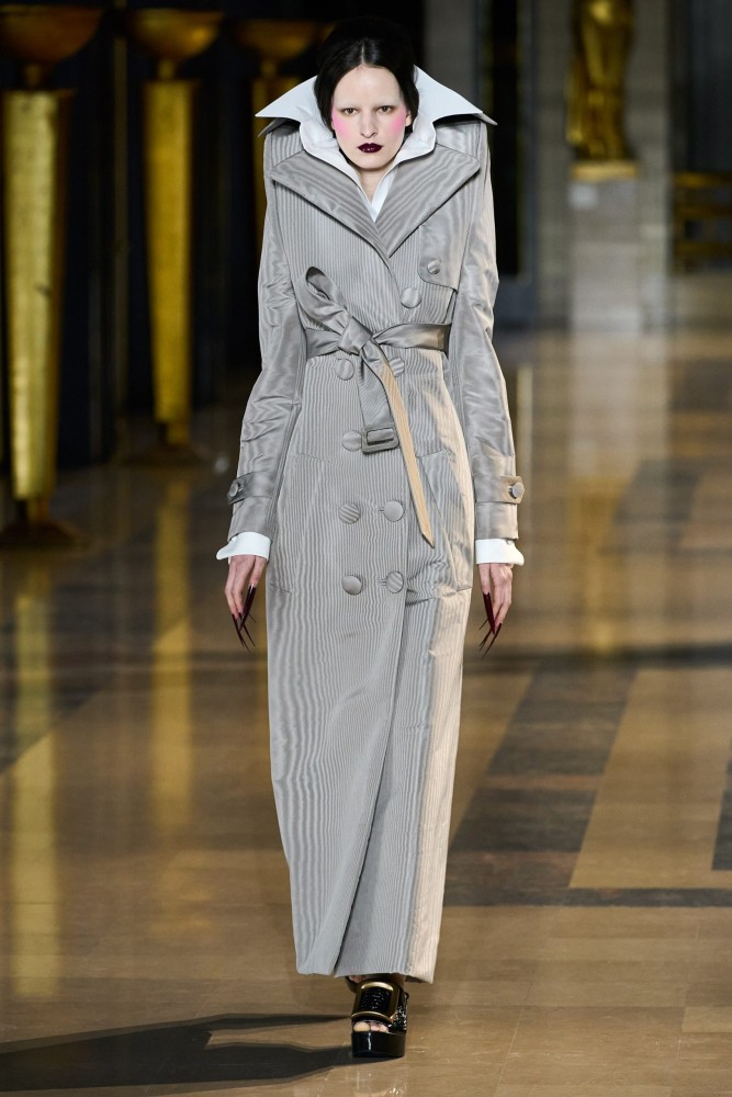 Think couture and you tend to think of refined pieces and hushed, moneyed environments. Area’s Beckett Fogg and Piotrek Panszczyk shook off this stereotype with a bold, dramatic show inspired by Las Vegas showgirls, the Art Deco glamour of Zizi Jeanmaire and the exuberant costumes of Brazil’s Carnival. Metal headpieces, tops and jewellery were designed by German artists, trousers were covered in sequins, models wore helmets and horns, and every look was more extravagant than the last.