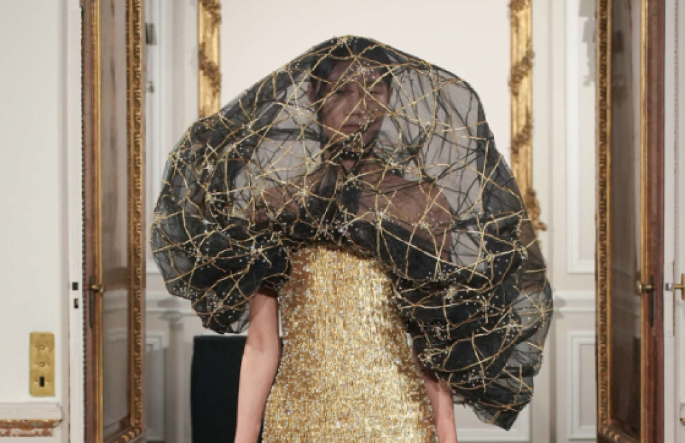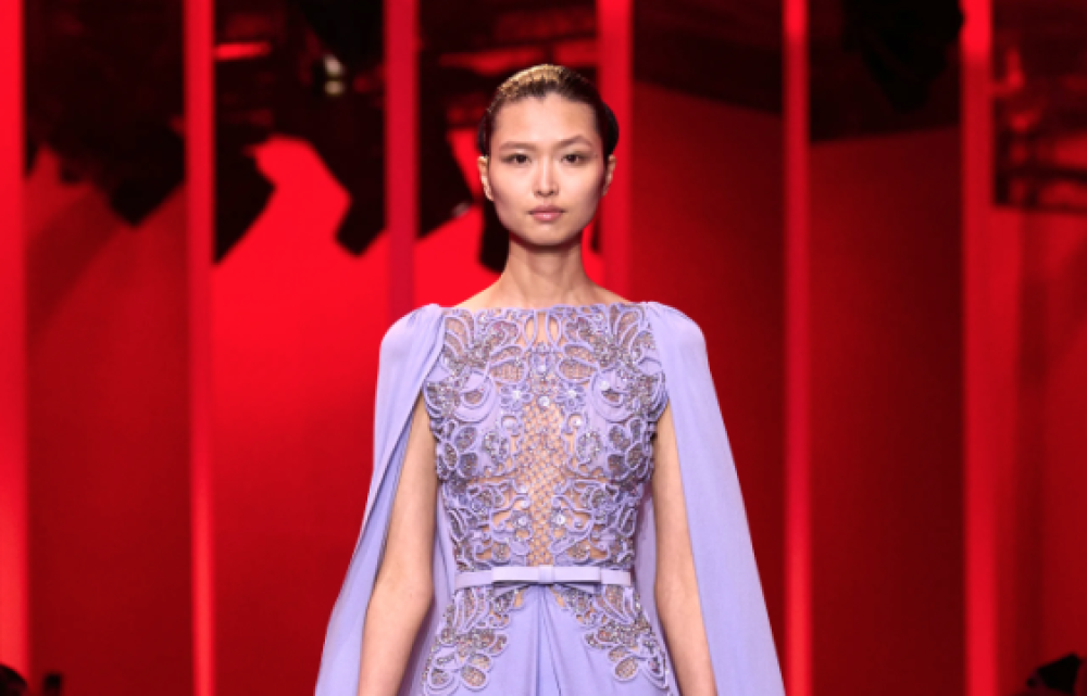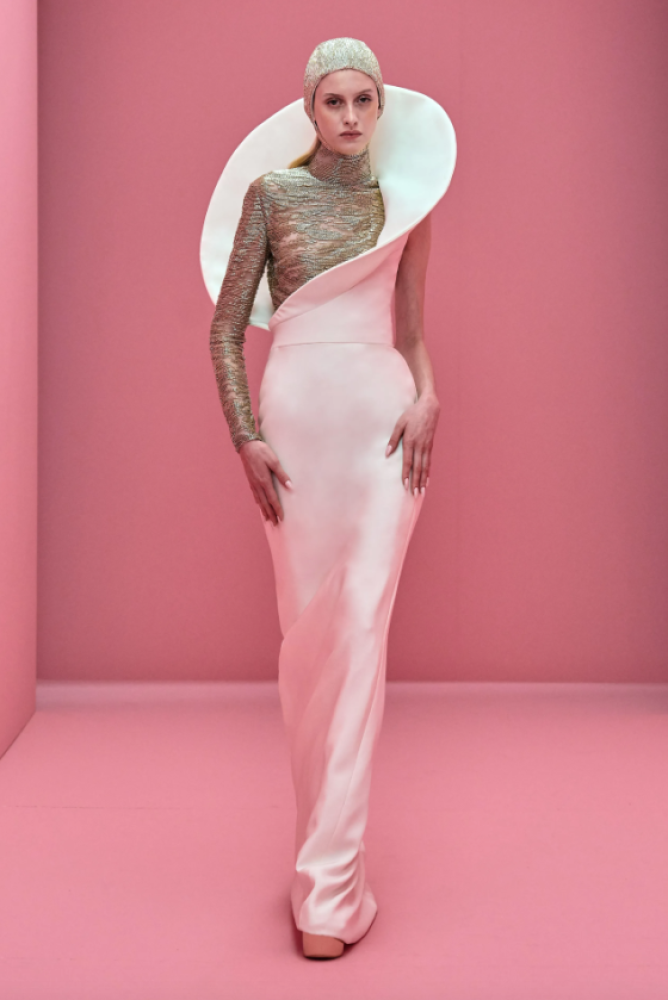 Saudi Arabian couturier Mohammed Ashi presented Ink Sculpture, a stunning and sculptural collection inspired by Japanese poetry and calligraphy. Aside from two glittering gold dresses and a fitted silver