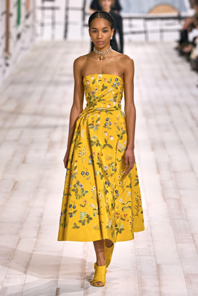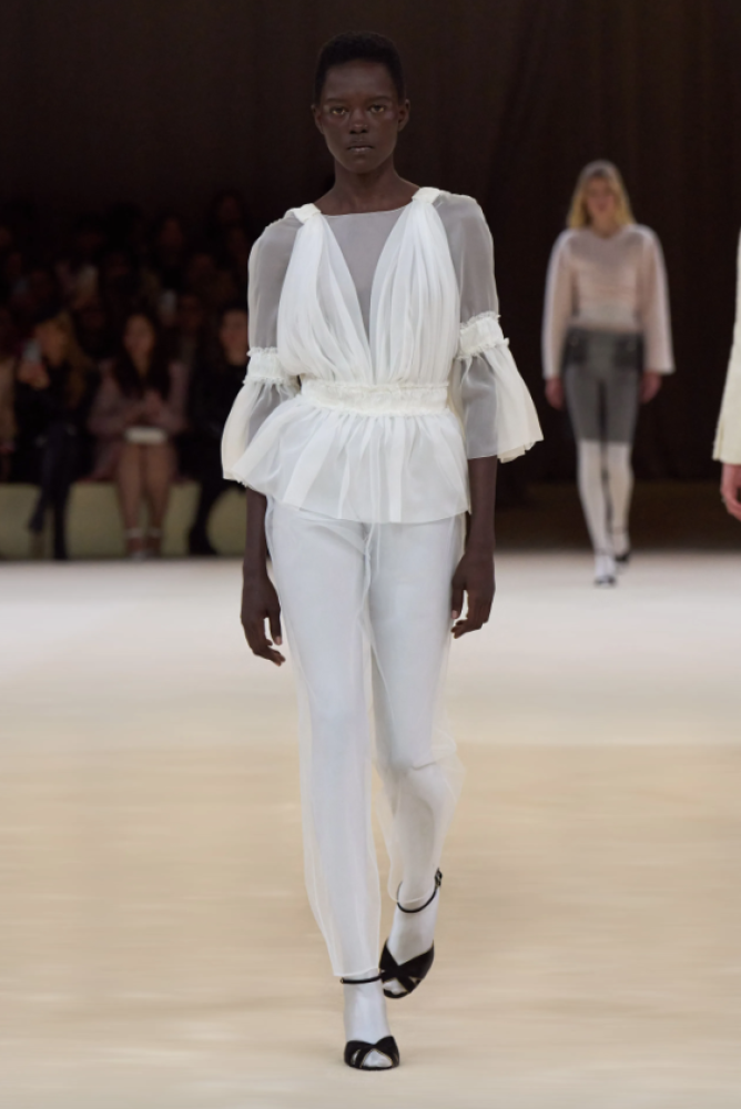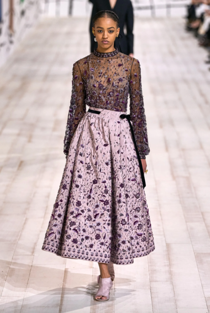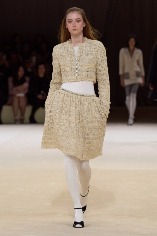 For this season, Virginie Viard dreamt up a delicate ballet core collection that was full of tulle skirts, tutus and leotard-esque bodices styled with white tights. The show opened with actress Margaret Qualley in a tweed jacket with a chiffon Pierrot ruff, a reference to founder Gabrielle “Coco” Chanel’s previous designs. To close the show, Viard’s couture bride wore a short floral-printed frock with airy white chiffon balloon sleeves and a long white tulle train.