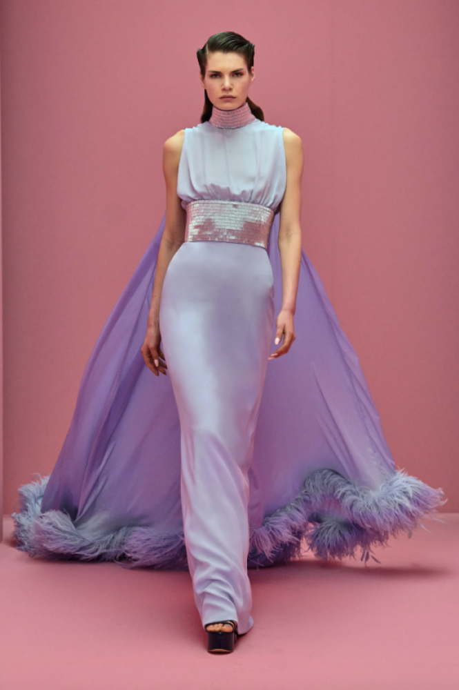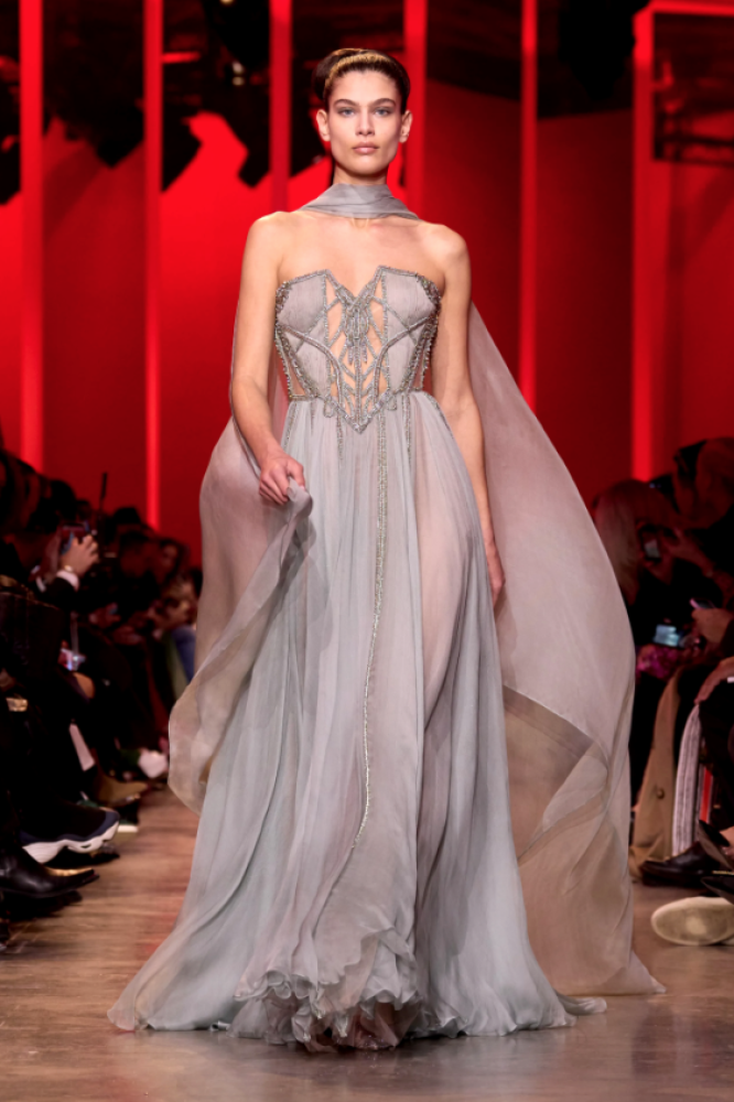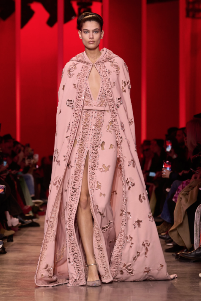Elie Saab explored “the magic of Marrakesh and of the mystery of the desert rose” in this glamorous, regal and totally red-carpet-worthy collection. Standout looks included a dusty rose lace gown with a matching floor- length hooded cape and a flowing pear-green gown with a glittery 3D flower-encrusted bodice. His couture bride wore a long-sleeved cream gown with gold-embroidered side panels, and accessorised with a jewelled headband and cream veil.