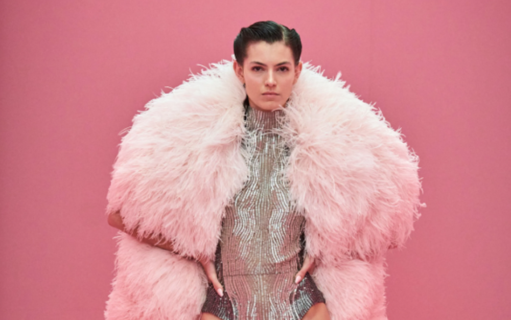 For the SS24 Couture season, Rome-based atelier Antonio Grimaldi created Bathing Beauty, inspired by Esther Williams, an American competitive swimmer turned Hollywood star of the 1940s and ’50s. The first look featured a beaded leotard underneath a massive fluffy pink feather jacket. Other subtle nods to his muse included abstract wave-like bodices, and sweeping gowns with matching hoods reminiscent of a swimming cap.