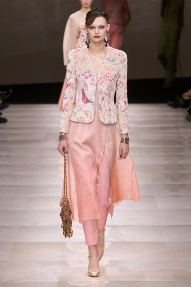 Giorgio Armani’s latest collection was entitled Haute Couture en Jeu, a French phrase with a double meaning of “putting couture into play” and “couture is having fun”. The garments definitely suited the theme: frothy ruffled skirts in light pastels and splashed watercolour-printed fabric, and delicate lace gowns encrusted with tiny crystals. He presented a beautiful parade of varying textures, colours and silhouettes.