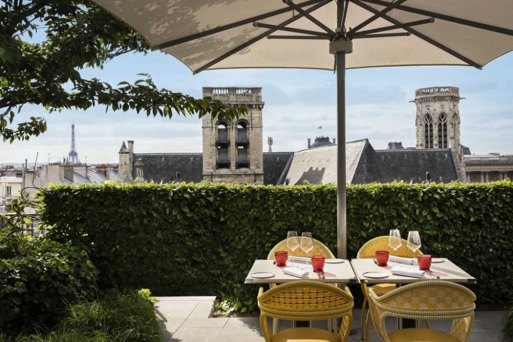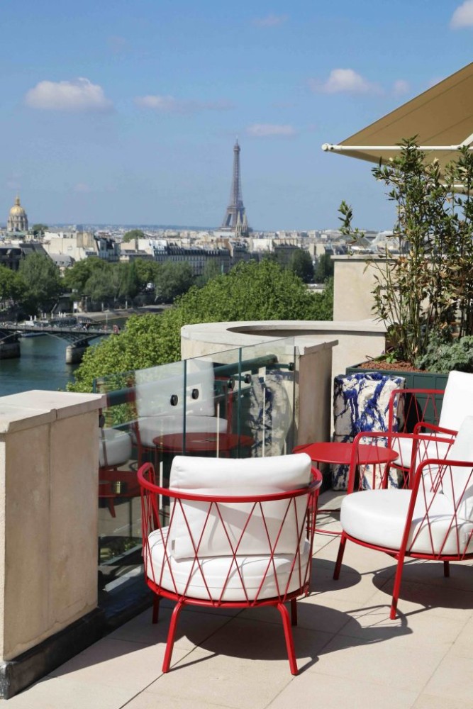 The address overlooks the rooftops of the city. Facing south, the terrace is lined with balconies and intimate alcoves to embrace the most beautiful views of the Seine, from Notre-Dame to the Eiffel Tower, for a lunch under the sun or a dinner under the stars, in a delightful frenzy.
