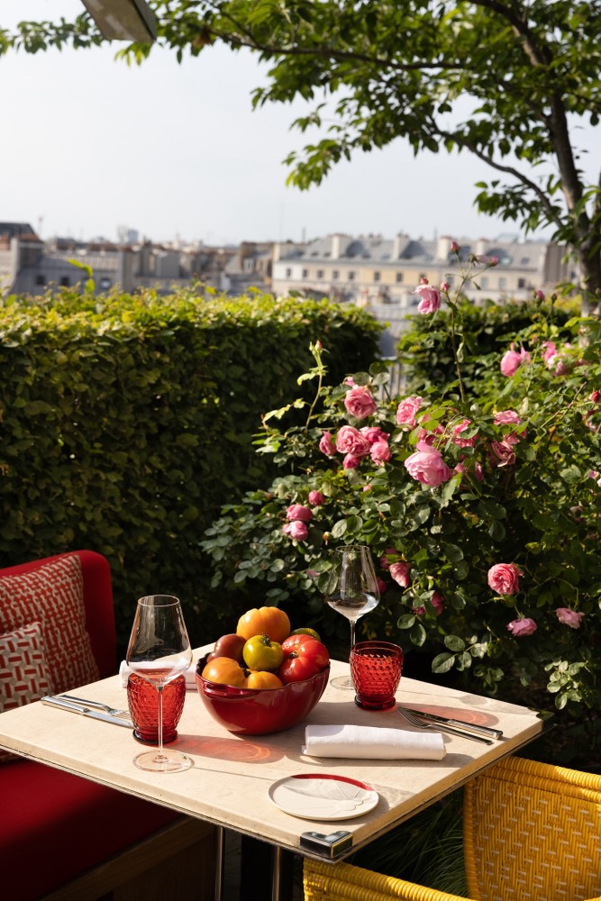 This rustic atmosphere with its pathways where red flowers share the spotlight with aromatic herbs emits a quintessential summery scent of lemon thyme, basil, and rosemary. Le Jardin de Cheval Blanc Paris is a playful retreat that offers spirited competitions of Mölkky, furious spins on the table football, a giant chess game, for kings, queens, and of course, knights of all ages.