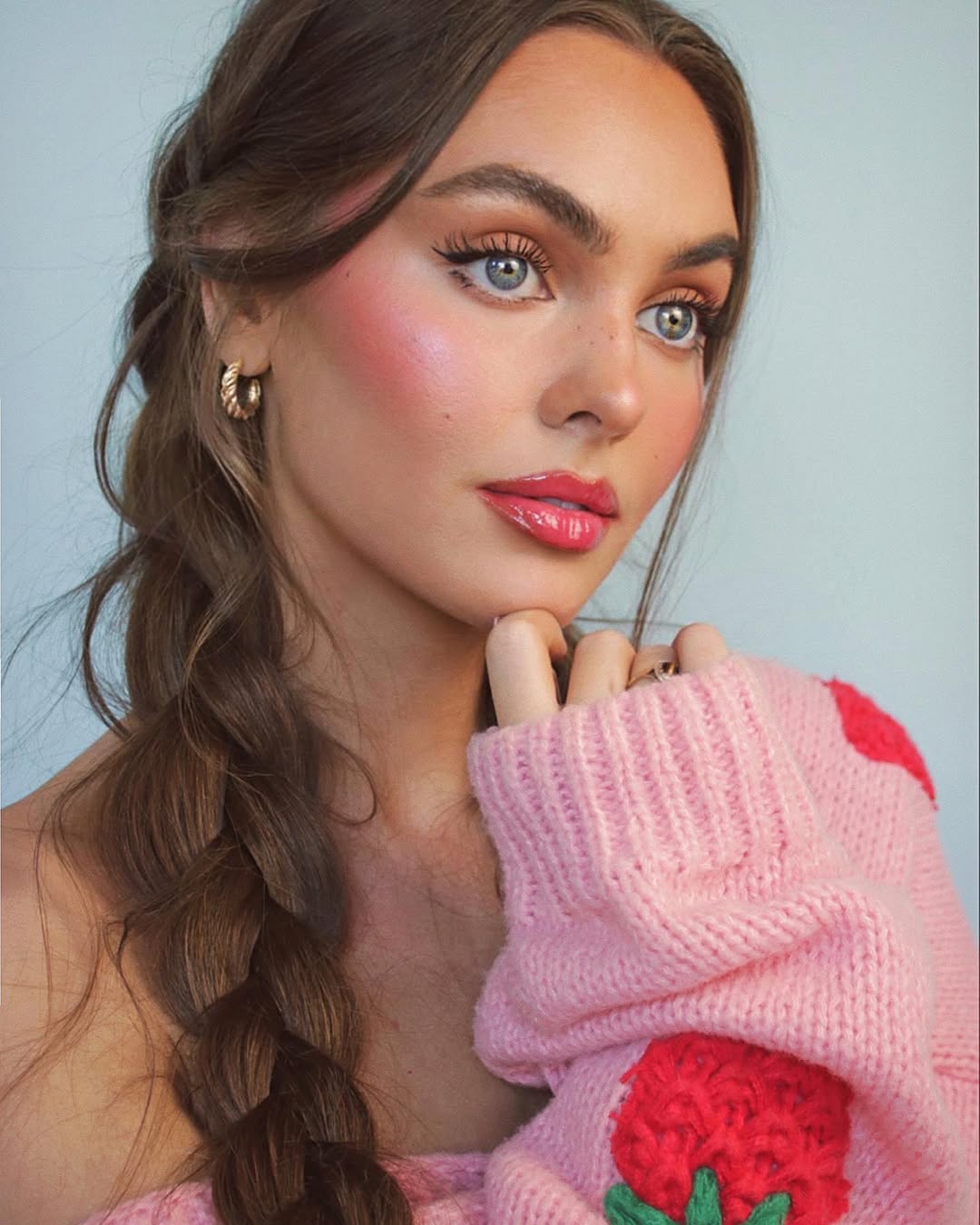 เป็นอีกหนึ่งลุคสวยหวานที่ได้รับความนิยมและเป็นที่รู้จักในวงกว้างจากเซเลบริตี้ชื่อดัง Hailey Bieber ที่จะโดดด้วยสีชมพูชวนให้นึกเด็กสาวและสตอเบอร์รี่อันเป็นที่มาของลุคนี้ ไม่ว่าจะเป็นที่บริเวณเปลือตา แก้ม ด้วย Rare Beauty Stay Vulnerable Melting Blush สี Nearly Rose ตลอดจนริมฝีปากที่จะต้องอวบอิ่มและดูอมชมพูด้วย Gloss Bomb Universal Lip Luminizer สี Fussy