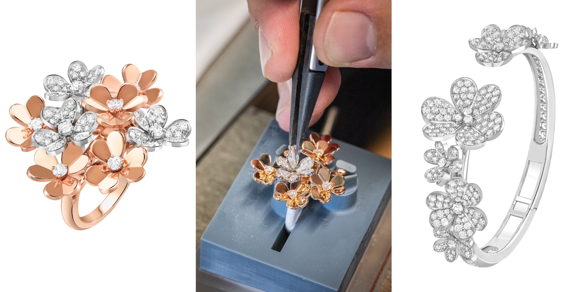 ไฮไลต์สำหรับซีซั่นนี้คือการผสมผสานทองหลากเฉดสีในเครื่องประดับหนึ่งชิ้นอย่างแหวนตัวเรือนกลีบดอกรูปหัวใจทำจากทองคำสีกุหลาบและทองคำขาว 18k ทั้งหมด 8 ดอกผสมผสานกันเป็นช่อดอกที่อ่อนช้อยงดงามพร้อมการตกแต่งเพชรจับประกายที่ชวนให้แหวนดอกไม้สวยสะดุดตาเมื่ออยู่บนเรียวนิ้ว หรือกำไลปลายเปิดรังสรรค์ด้วยตัวเรือนกลีบดอกรูปหัวใจทำจากทองคำขาว 18k ไล่เรียงกันต่างขนาดรวมกันทั้งหมด 7 ดอกประดับด้วยเพชรกว่า 300 เม็ดเป็นงานดีไซน์ที่ดูทันสมัยและอ่อนช้อยในเวลาเดียวกัน