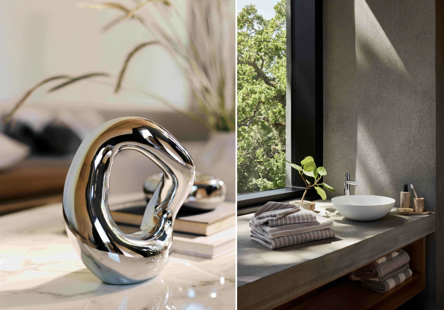 ส่วนสุดท้ายที่เป็นดั่งพื้นที่แห่งความสงบอย่างห้องนอน ทางแบรนด์ได้รังสรรค์ชุดเครื่องนอนโทนสีกลาง ทั้งสีขาวนวล เบจ และเทา สร้างบรรยากาศผ่อนคลายอย่างมีสไตล์ ผ้าปูที่นอนมัสลินนุ่มสบายและผ้าคลุมเตียงเนื้อดียังช่วยเพิ่มความอบอุ่นให้กับค่ำคืนที่เงียบสงบ รวมไปถึงอุปกรณ์สำหรับห้องน้ำอย่างผ้าเช็ดตัวนุ่มสบายในโทนสีเบจ ขาว และดำ พรมเช็ดเท้าหนานุ่ม และอุปกรณ์ตกแต่งจากหินอ่อนที่ดูหรูหรา ต่างเป็นรายละเอียดที่ช่วยให้ห้องน้ำของคุณเป็นพื้นที่ผ่อนคลายอย่างแท้จริง
