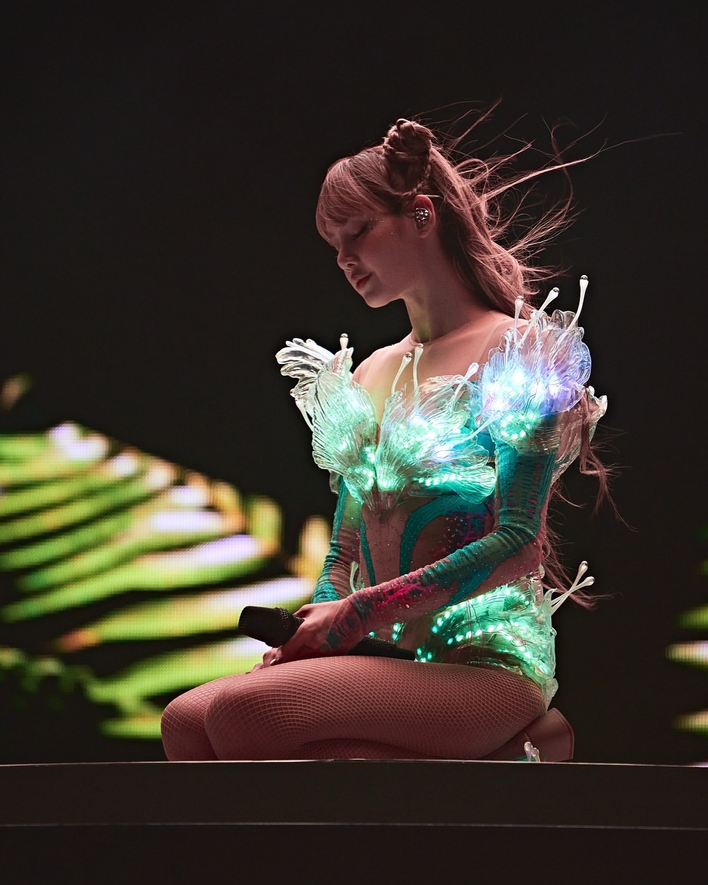 สำหรับลุคที่สอง เป็นชุดที่มีเส้นสายเรืองแสงราวกับแมลงและเห็ดเรืองแสงซึ่งเป็นแรงบันดาลใจหลักของชุดนี้ พร้อมกลีบดอกไม้ใสคล้ายแก้วแต่มีลักษณะที่โอนเอนพลิ้วไหวได้คล้ายพลาสติกใส และบอดี้สูทด้านในมีลวดลายเส้นสีสันสดใสคล้ายเส้นเลือดวิ่งไปตามร่างกาย พร้อมการใช้เทคโนโลยีไฟไร้สายฝังในตัวชุดซึ่งเป็นเทคนิคที่แบรนด์ใช้สร้างเอกลักษณ์ของตัวเองมาโดยตลอด โดยชุดนี้ให้อารมณ์ชวนฝันคล้ายกับว่าลิซ่าล่องลอยไปในอากาศและเปล่งแสงของออร่าของเธอออกมาในระหว่างที่แสดงโชว์ในเพลง Moonlit Floor