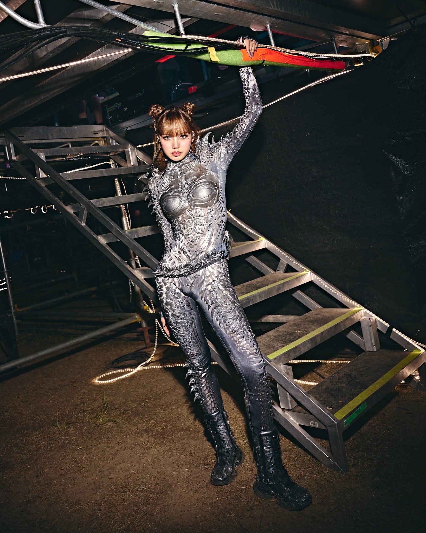 เสริมด้วยดีเทลโครงไหล่ที่แข็งแรงและมีหนามโค้งยื่นออกมา พร้อมเกราะหน้าอกที่ออกแบบขึ้นใหม่โดยเฉพาะสำหรับลิซ่า คอมพลีตลุคนี้ด้วยเข็มขัดหย่อนด้านหน้าแบบยุคปลาย 90s ที่ให้อารมณ์บริทนีย์ สเปียร์ส และการใส่เล็บปลอมที่มีลักษณธของบรรดาสัตล์เลื้อยคลานจริงๆ ฝีมือของ Juan Alvear ช่างทำเล็บชื่อดังที่ร่วมงานกับลิซ่ามาแล้วหลายครั้ง ลิซ่าสวมใส่ชุดนี้แสดงในเพลง Thunder และ FUTW