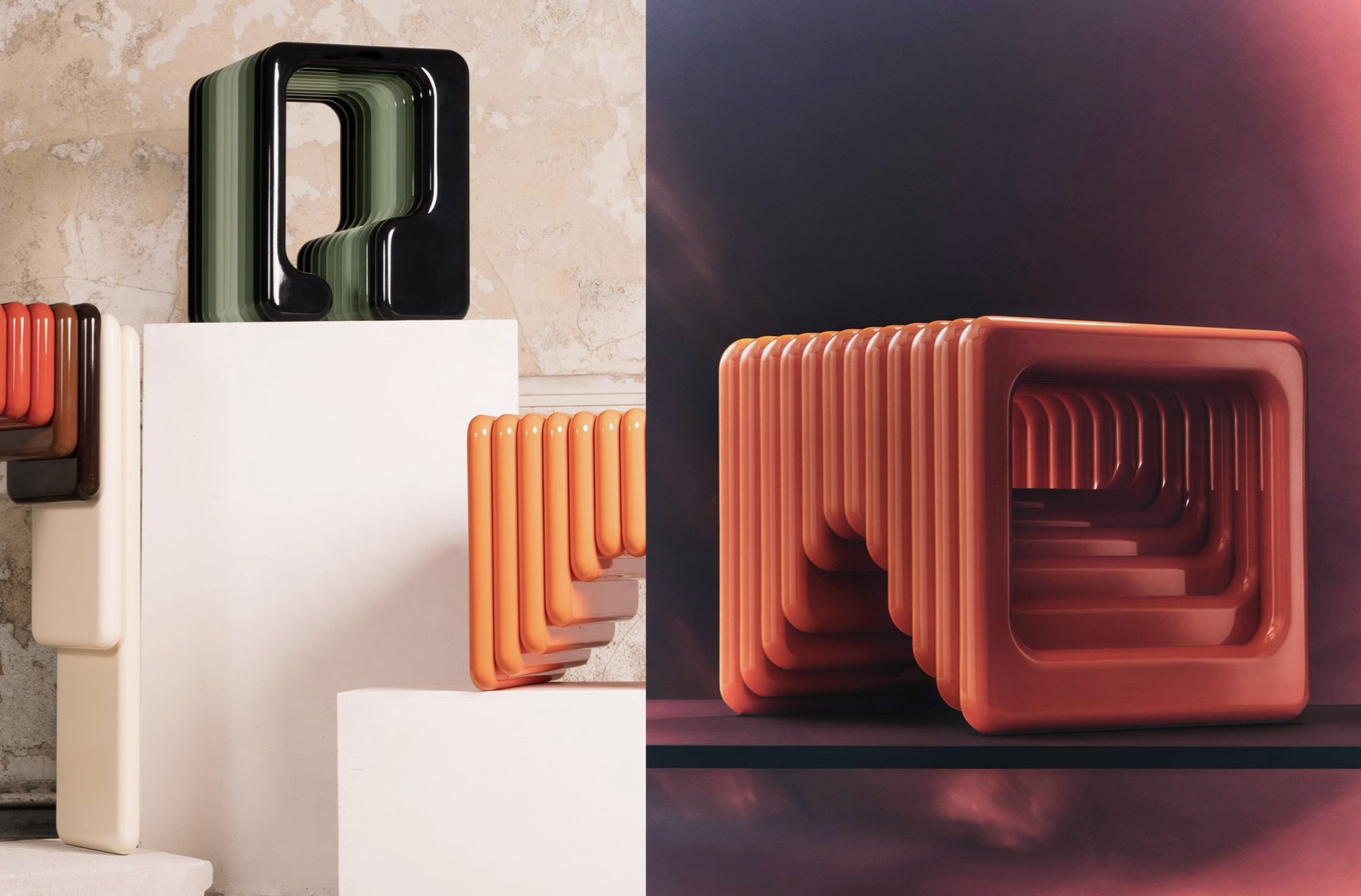เก้าอี้สตูลโทนสีสดที่สร้างขึ้นจากไม้เคลือบเงา โดดเด่นด้วยการออกแบบที่เล่นล้อไปกับดีไซน์ที่มีความโค้งมน การไล่ระดับ และการเชื่อมต่อแต่ละชิ้นส่วนเข้าหากันได้อย่างไร้รอยต่อแต่ยังคงไว้ซึ่งฟังก์ชั่นและลักษณะการใช้งานที่ไม่บกพร่อง ตั้งแต่เป็นโต้ะกาแฟขนาดย่อม ที่วางของ ไปจนถึงโฮมแวร์มากดีไซน์ที่แต่งเติมบรรยากาศให้กับพื้นที่ได้อย่างมีรสนิยม