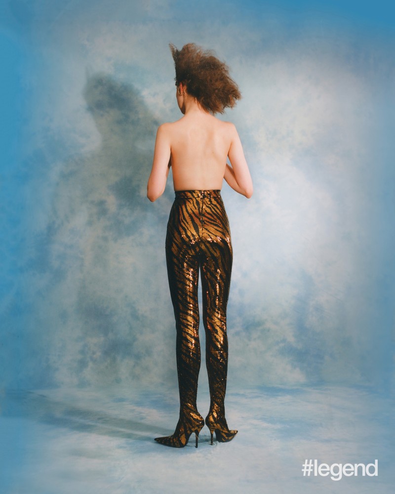 Model in Ambush earring and Balenciaga gold-sequinned leopard-patterned leggings with pumps -