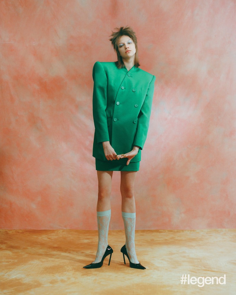Model in Balenciaga green blazer, skirt and black patent leather pumps, Ambush gold ring and Wolford blue sheer socks
