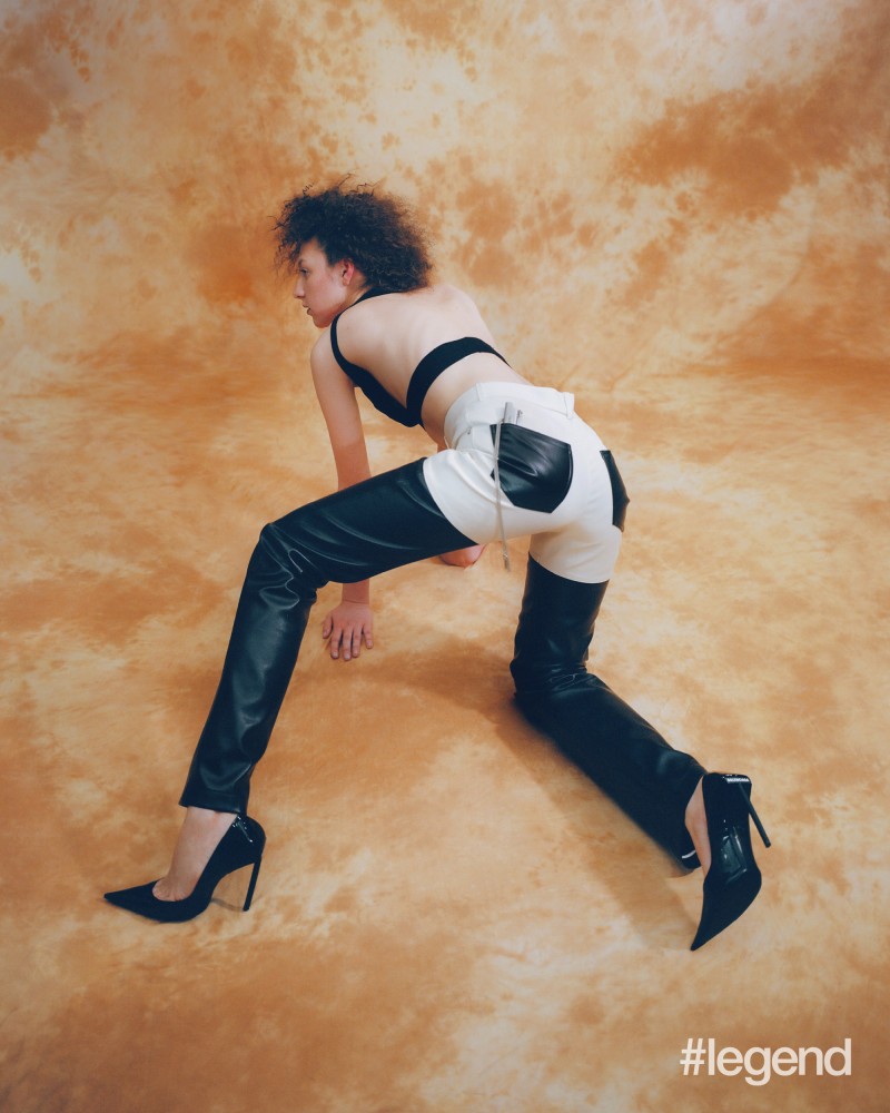 Model in Rick Owens black cut-out top, Peter Do black and white leather trousers available at Joyce, Ambush lighter case necklace and Balenciaga black patent leather pumps -