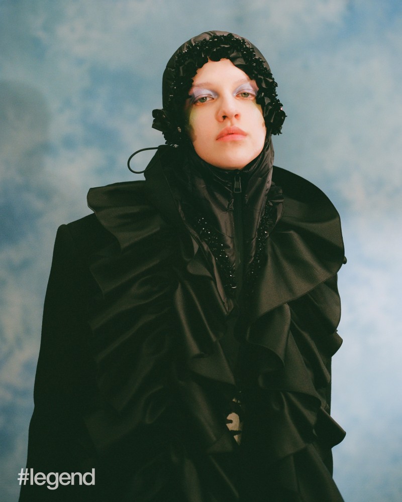 Model in 4 Moncler Simone Rocha black ruffled hood and Christopher Kane black ruffled blazer available at Joyce