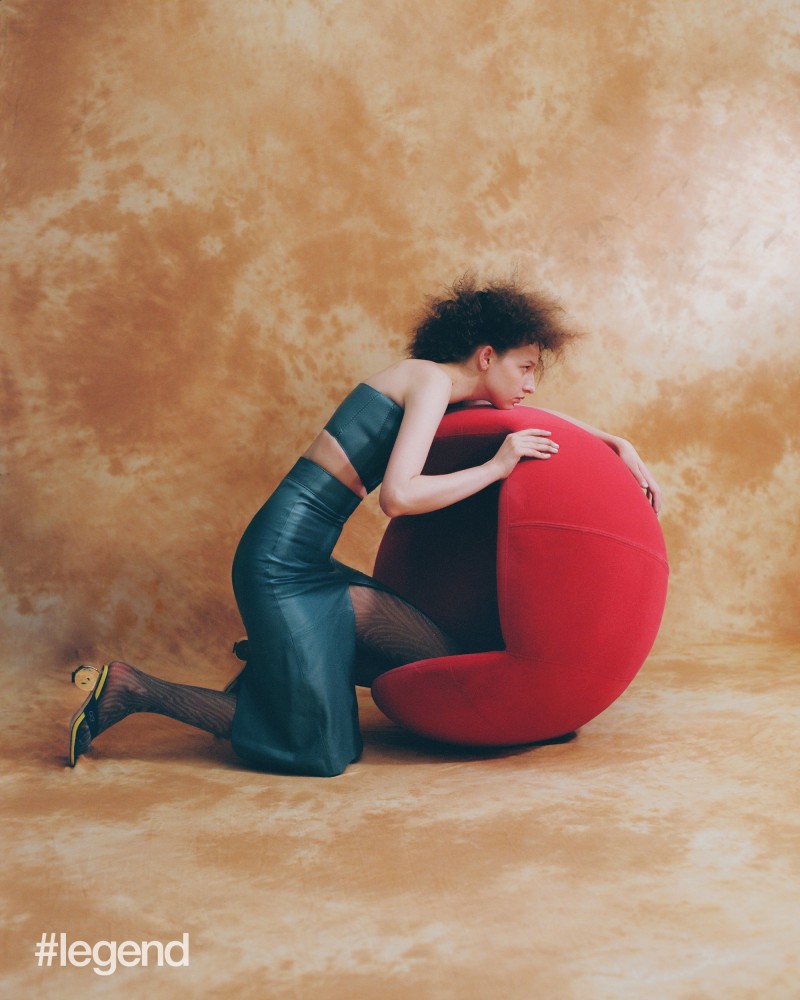 Model in Givenchy blue leather tube top and skirt, OI3 yellow sandals and stockings stylist’s own -