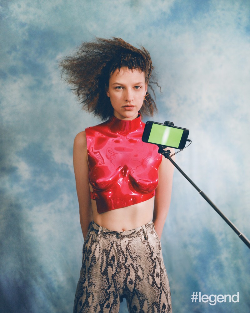 Model in Tom Ford fuchsia armour chest plate, MSGM snake print trousers and Gucci Gold earring