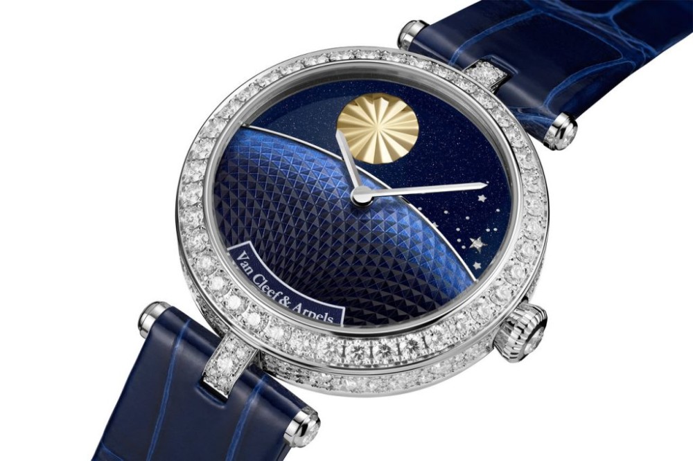 The white gold pieces are beautifully decorated with diamonds and sapphires, with the dials fashioned out of aventurine, nodding to the glistening night skies: the moon and sun atop a rotating disk complete a full journey every 24 hours.