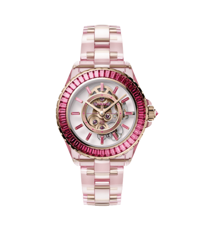 In addition to her affinity for black and white, Mademoiselle Chanel had a fondness for the colour pink, evident in many of the maison’s collections and designs. Which is why the Chanel Watchmaking Creation Studio turned to this classically feminine hue for its new limited-edition J12 and Boy•Friend watches. Numbered to only 12 pieces, the J12 X-Ray Pink Edition shows off its internal workings with a clear case of pink sapphire crystal and beige gold (a Chanel signature), set with pink sapphires and beige gold hands. A pink sapphire crystal bracelet completes the piece, which is also accented with beige gold links set with pink sapphires.